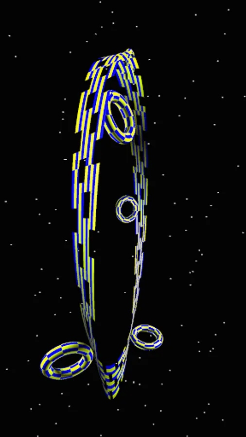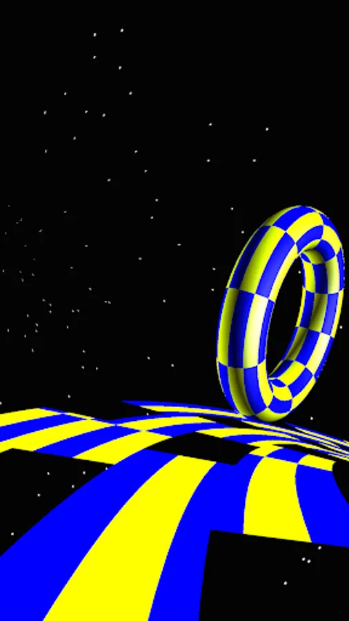 There is a Mobius strip in the space with rolling toruses on its surface. You can switch the camera to either birds view or near view by tapping the screen. In near view you can move the camera to the side by swiping horizontally.