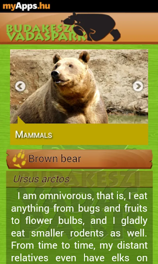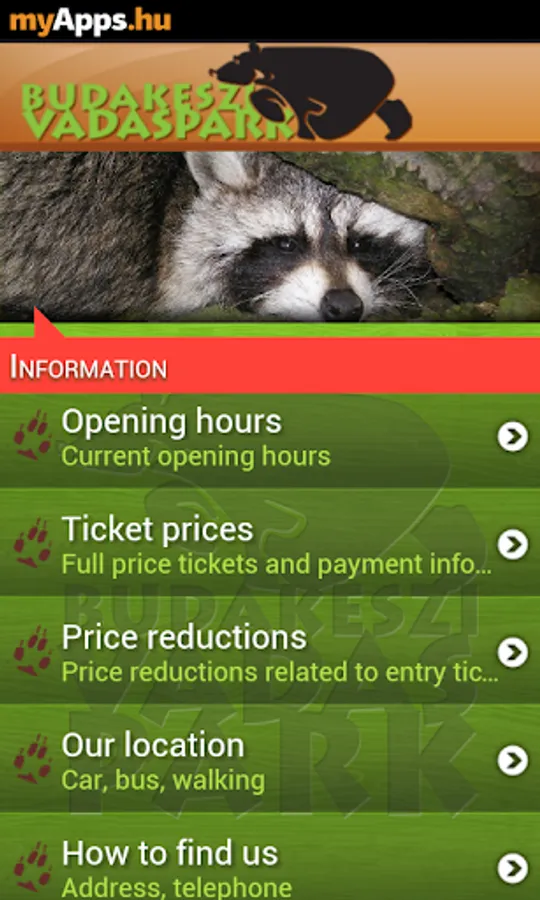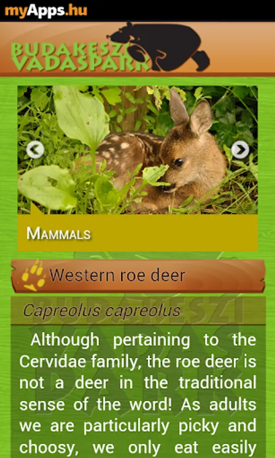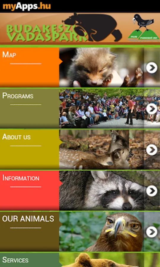 Get to know the programs of the Budakeszi Vadaspark, and meet its inhabitants with the help of our mobile application! Interesting descriptions, unique photos, and programs led by our professional staff members bring these wonderful creatures closer to you. With the integrated audioguide feature you can listen to the information of your favourite ones. What is more, descriptions and information of the animals included in the app can be shared with your friends, as well.