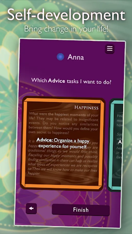 You can continue to play the game multiple times. If you do the "Advice " tasks - as an out-of-game homework - you can bring the changes from the theoretical level, from the level of intellectual understanding to the practical level, and they can become part of your life, your realizations can lead to lasting improvements to your life.