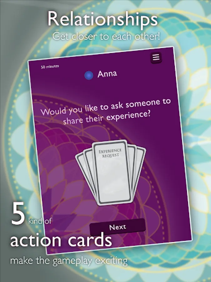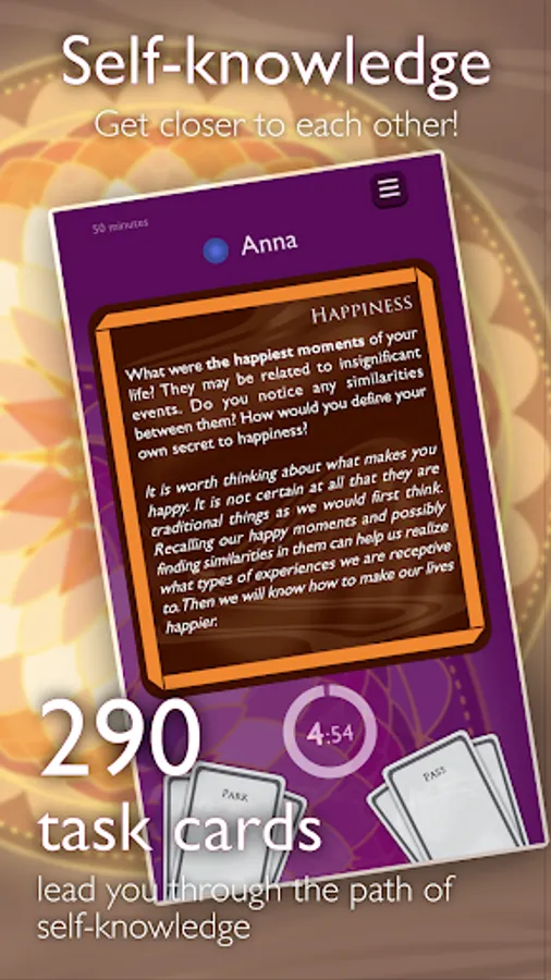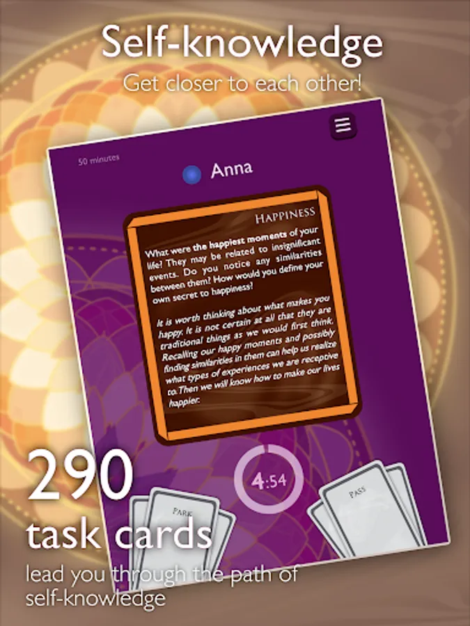 Ez a játék egy izgalmas, mély beszélgetés vezérfonalát adja. Ha megválaszoljátok a kártyákon hozzátok kerülő feladatokat, gyarapodtok önismeretben, közelebb kerültök önmagatokhoz és egymáshoz is. Ennek a játéknak nincs nyertese, de ha képesek vagytok a bizalom, a tisztelet és a törődés szellemében működni, akkor minden egyes játékos, valahányszor játszik, nyerni fog.