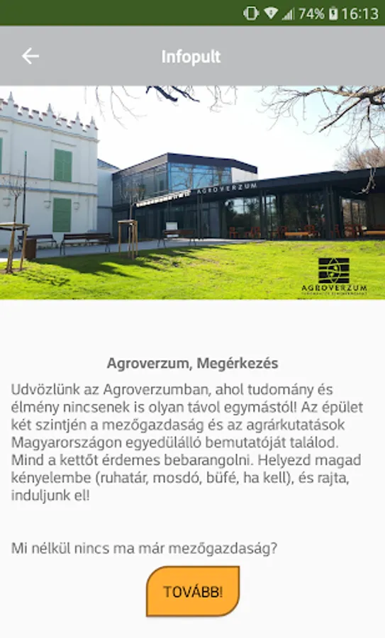 The Agroverzum Science Center is a visitor center of the Agricultural Research Center of the Hungarian Academy of Sciences in Martonvásár. It is an educational center and a scientific playhouse at the same time. Its main purpose is to raise awareness of agricultural sciences, to understand intelligent and enjoyable science-mediation. On two levels, 650 square meters of agricultural and scientific interactive permanent exhibition can be seen. His topics concern the areas of agricultural science that are researched by institutes of the Research Center for Agricultural Sciences of the Hungarian Academy of Sciences: scientific basics of soil, plant breeding and plant protection, and veterinary science. The exhibition focuses on the consequences of climate change on agriculture, eg. with the appearance of torrents, pests, soil erosion or drought. It also presents the scientific basics of agricultural sciences. His message is that the agricultural sciences in the field of agriculture can provide answers to the economic and social challenges caused by climate change.