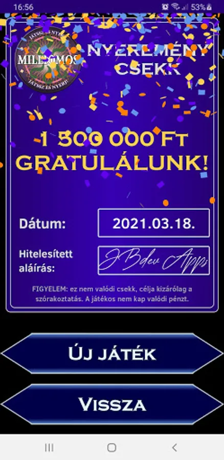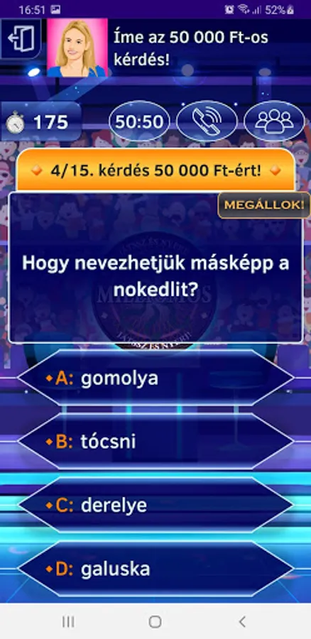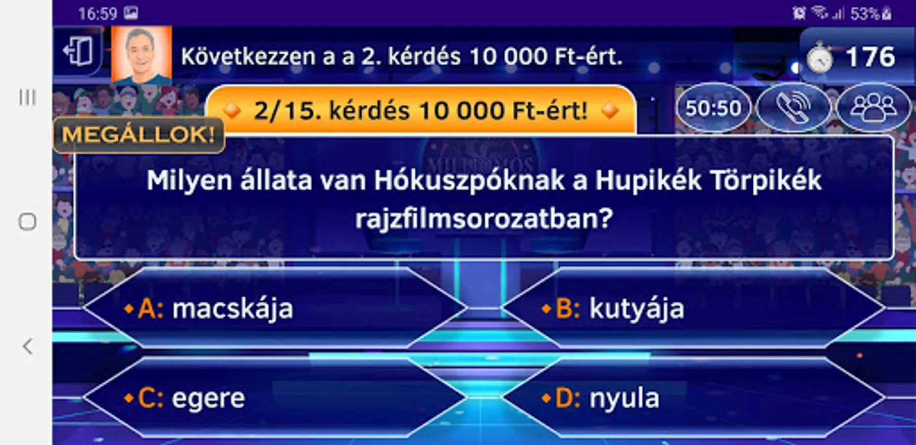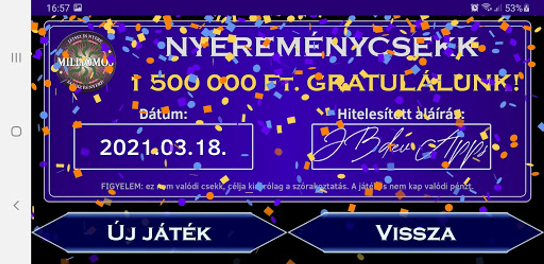The difficulty of the questions depends on the prize: to get the bigger prize, you have to answer more and more difficult questions well! Like the well-known game, there are three types of help available to you: telephone help, audience help, halving.