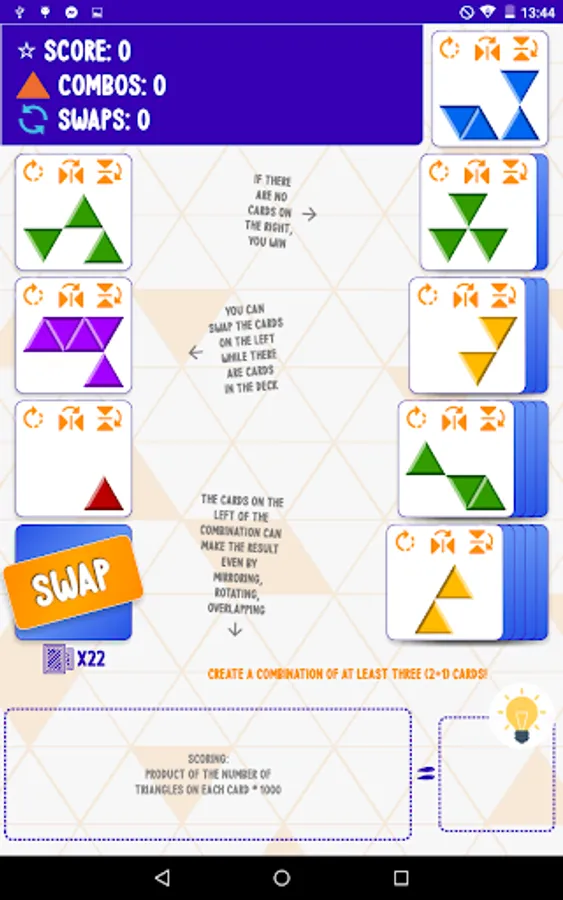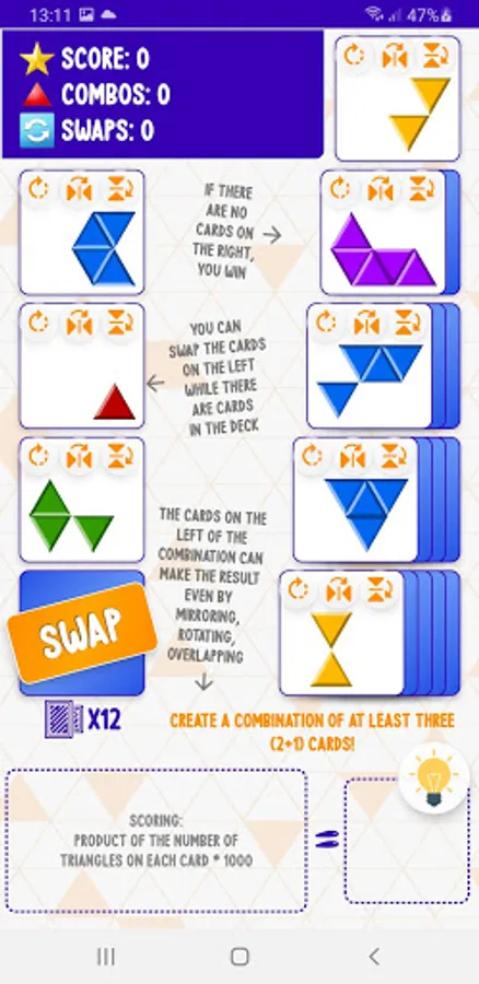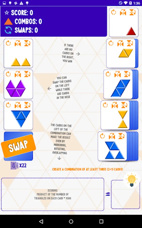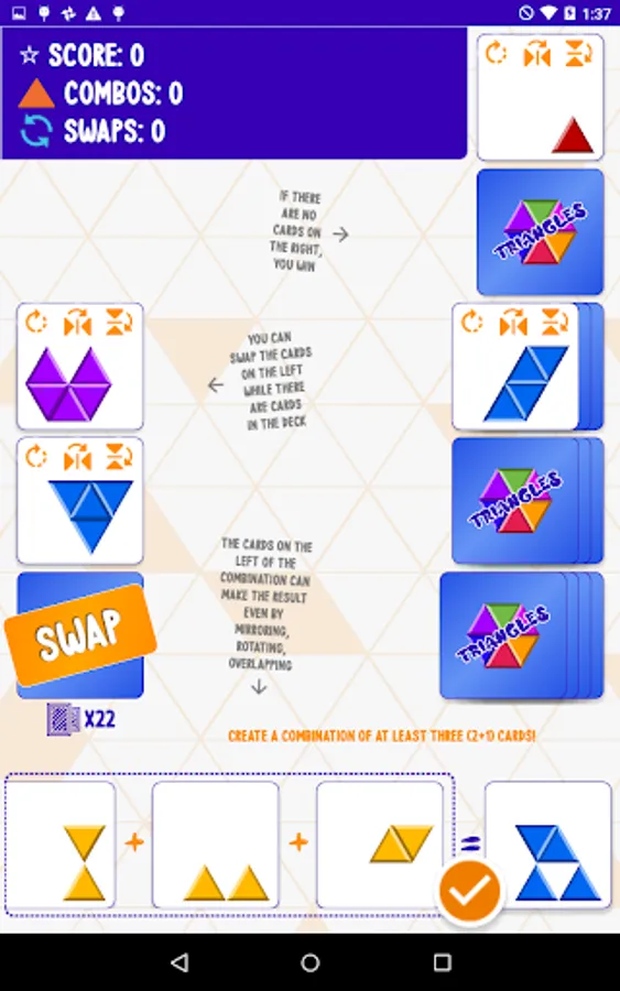 Make combinations of two or more cards that make the shape on another card. The cards can make the result even by mirroring, rotating, or overlapping each other.