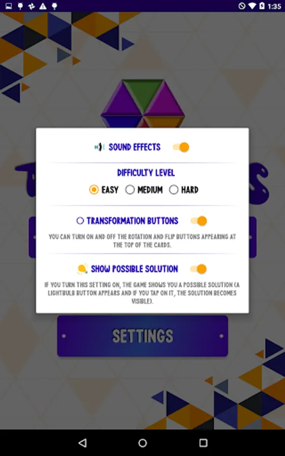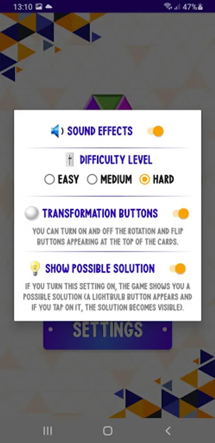 In Settings, you can turn on and off the rotation and flip buttons appearing at the top of the cards. These buttons help you to see other forms of a card. You can turn on and off the game offering you a possible solution (showing a lightbulb button).