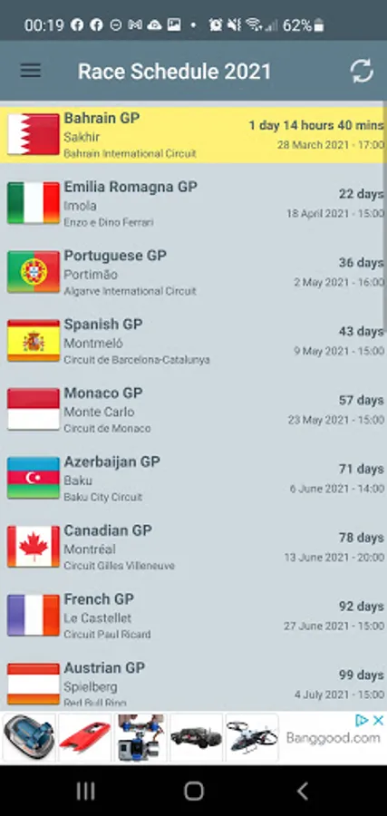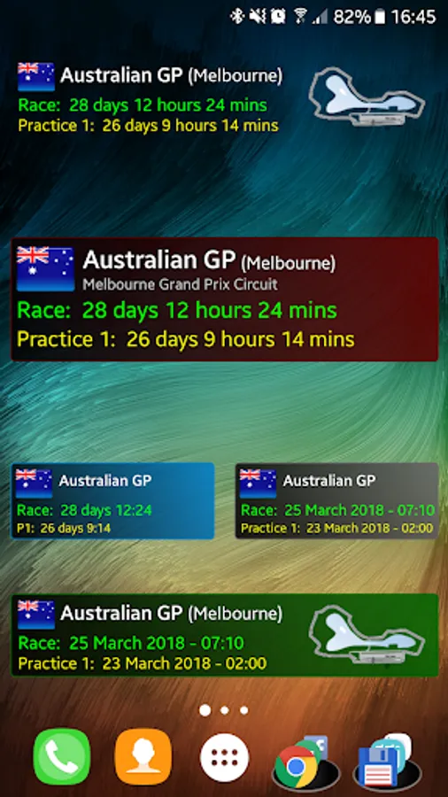 You can add several countdown widgets to your home screen and you can easily customize them at the creation or later by tapping flag icons. If you touch anywhere else in the counters you can see the dates, details and map of the next Race.