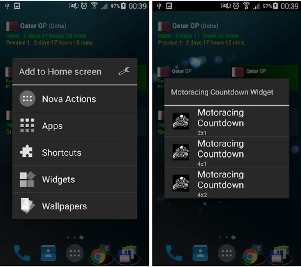 You can add several countdown widgets to your home screen and you can easily customize them at the creation or later by tapping flag icons. If you touch anywhere else in the counters you can see the dates, details and map of the next Race.