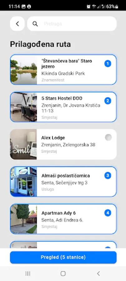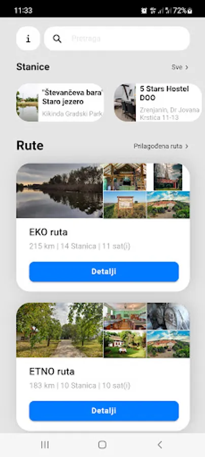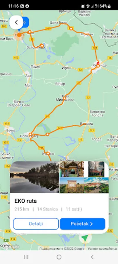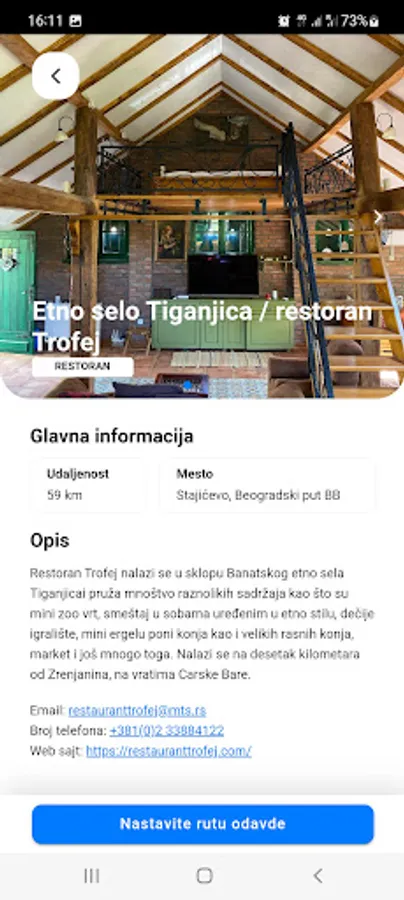 The application displays the length of the route, images and description of attractions and services for the selected thematic route.