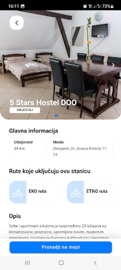 With one click, you can search for nearby accommodation, camp, restaurant, hotel or bicycle shop-service.