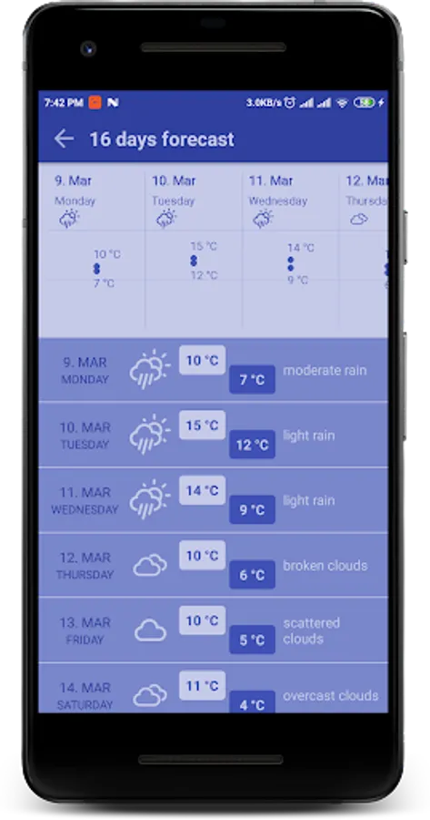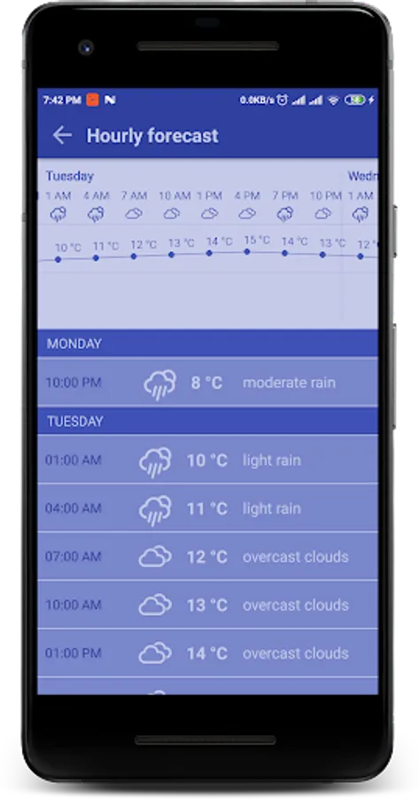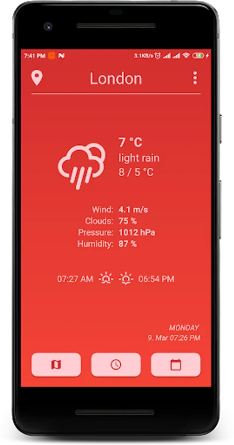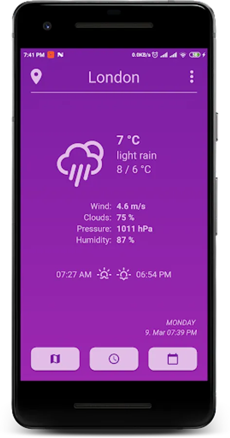min/max temperature, wind, clouds, pressure, humidity, sunrise, sunset