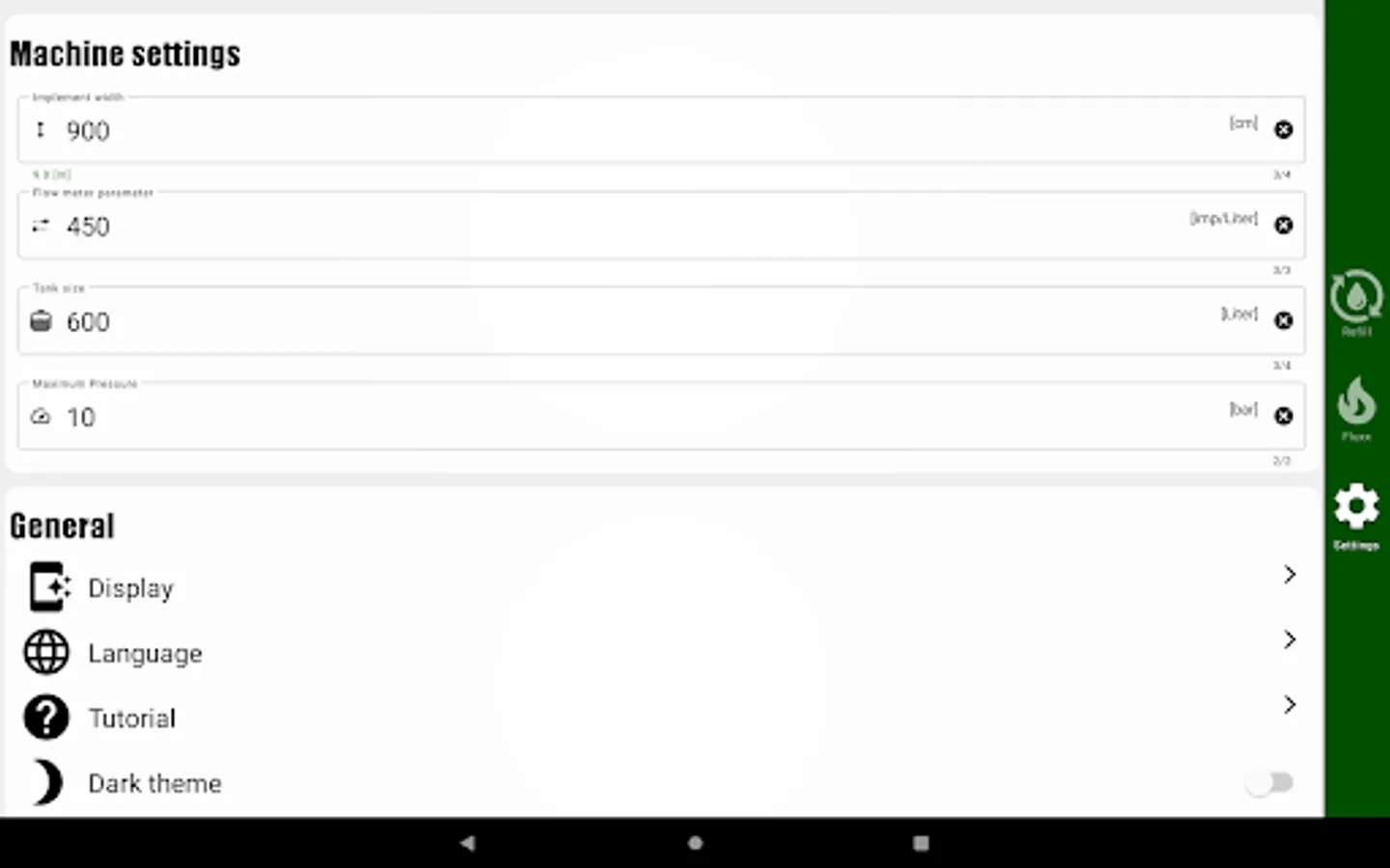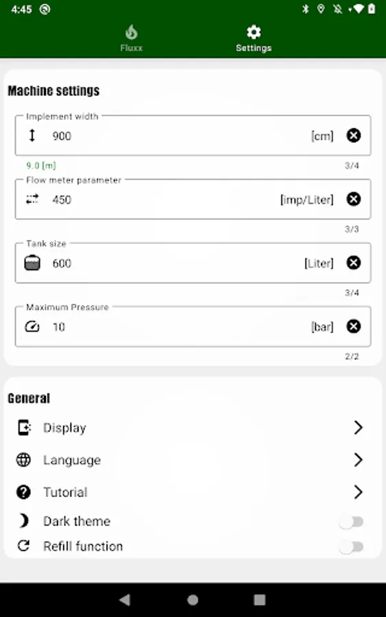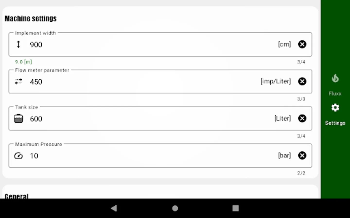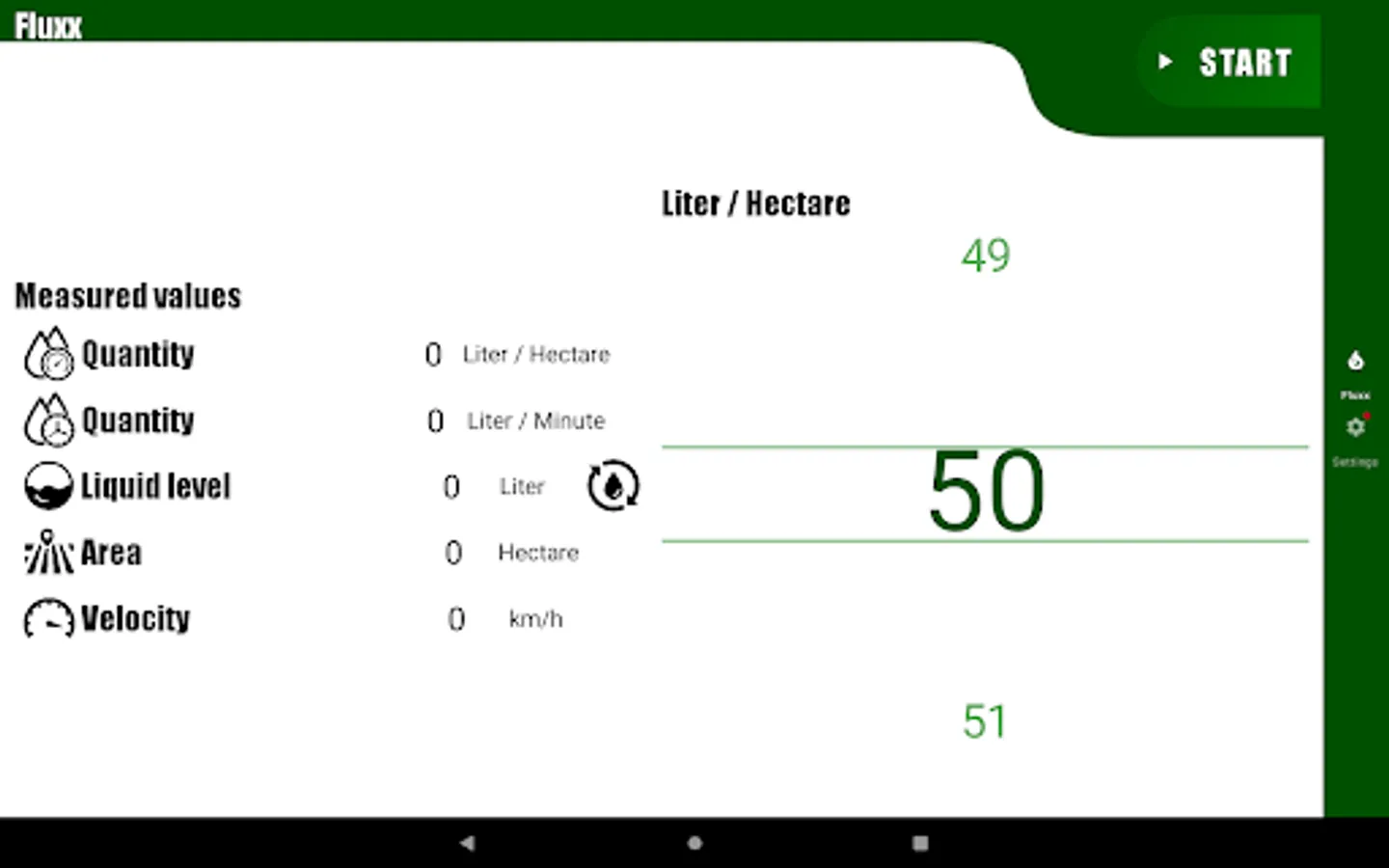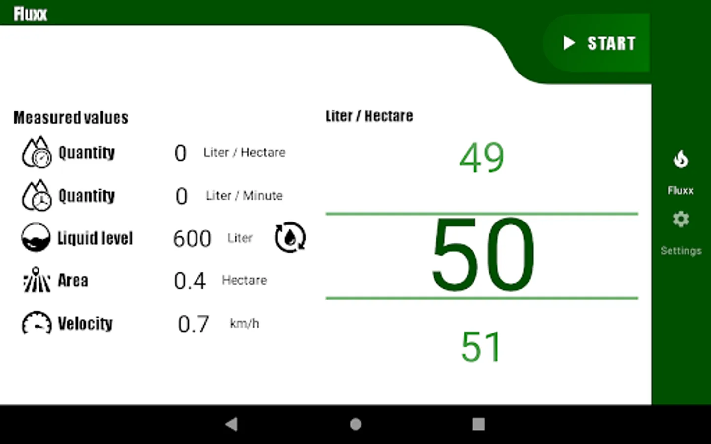 All features of Fluxx are available for free from the GooglePlay Store. The application provides precise application rate control. The software measures the current application rate, the current fluid level, and the size of the cultivated area.