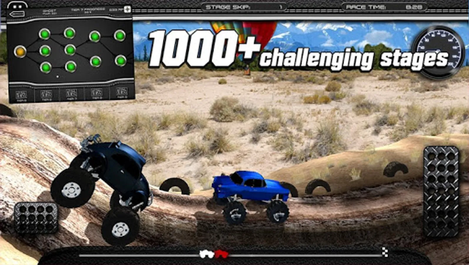 HILL 4x4 TUNING RIVALS offers you head-to-head racing with hill climb style through green forest and sandy desert against opponent (AI) with different strength. Race and win races to be able to unlock next tiers. Collect racing points (RP) upgrade your monster car or purchase a better one. If you don't like looks of your monster car you have a possibility to change color, decal and rim.