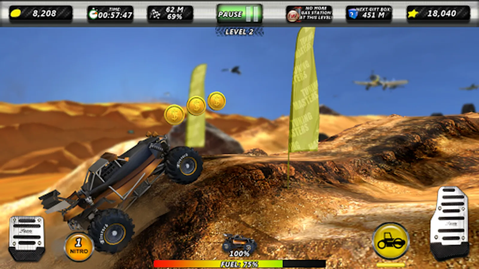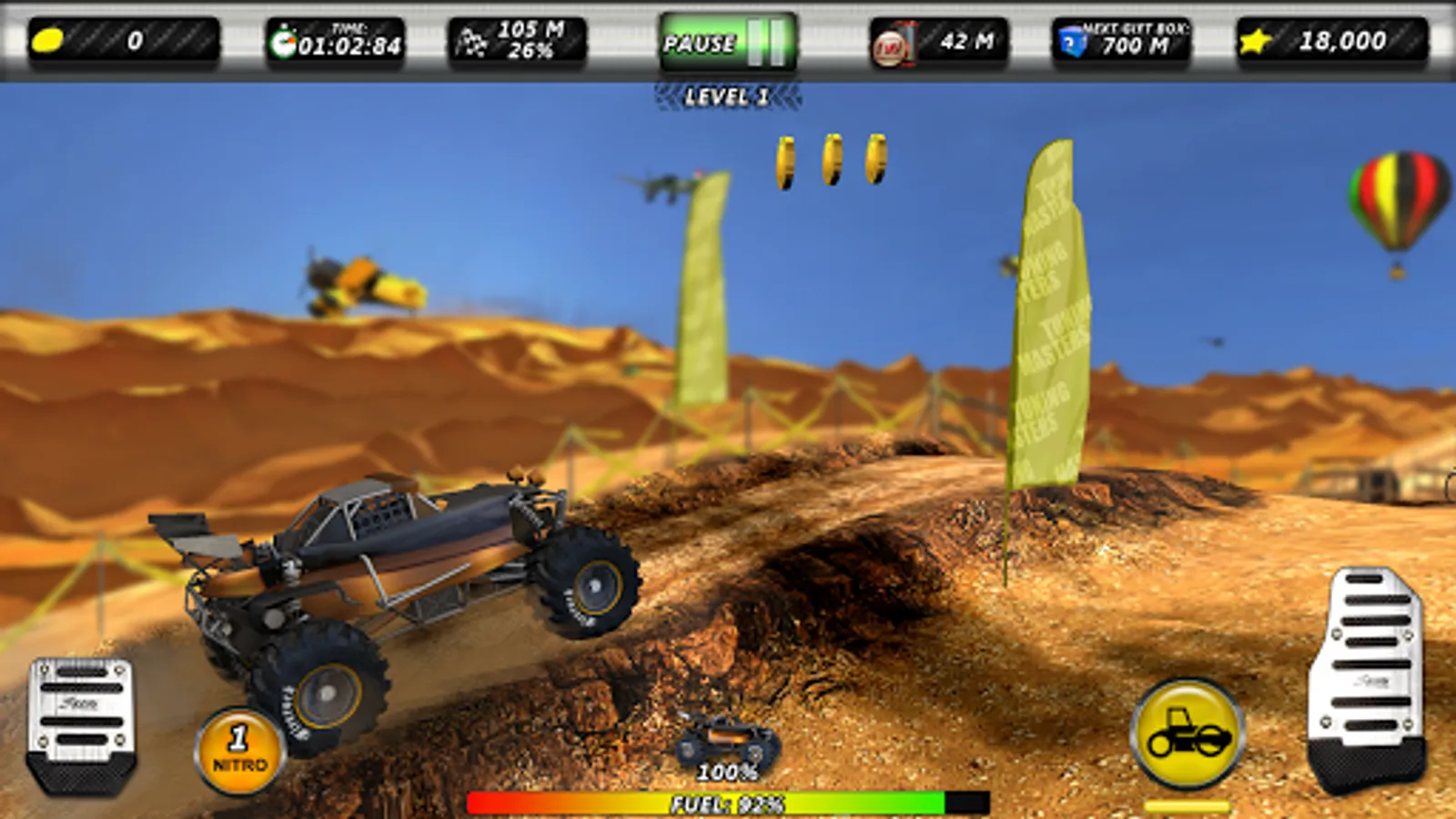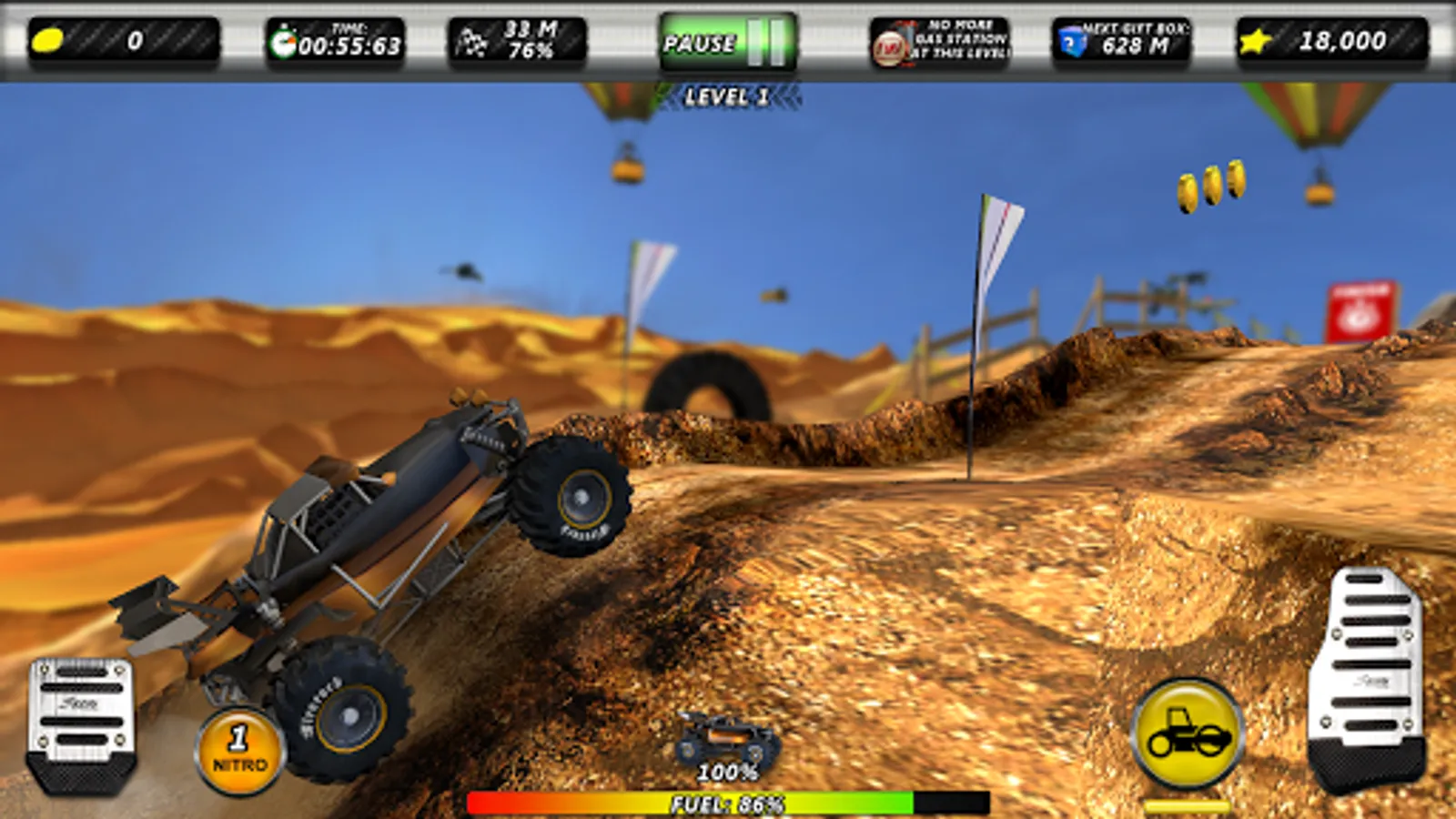 Face the challenges of unique hill climbing environments. Gain bonuses from collect coins to upgrade your car and reach even higher distances. Watch out though your vehicle will easily run out of fuel.