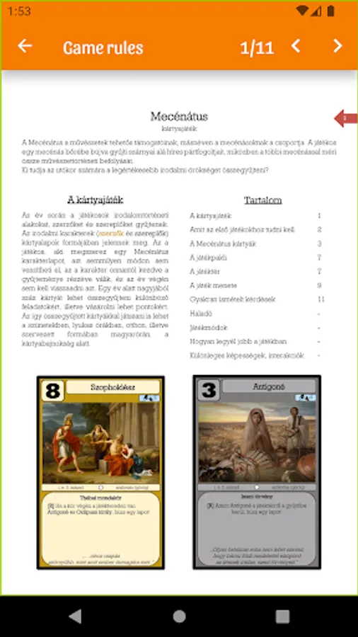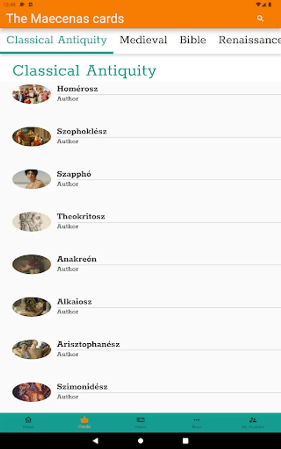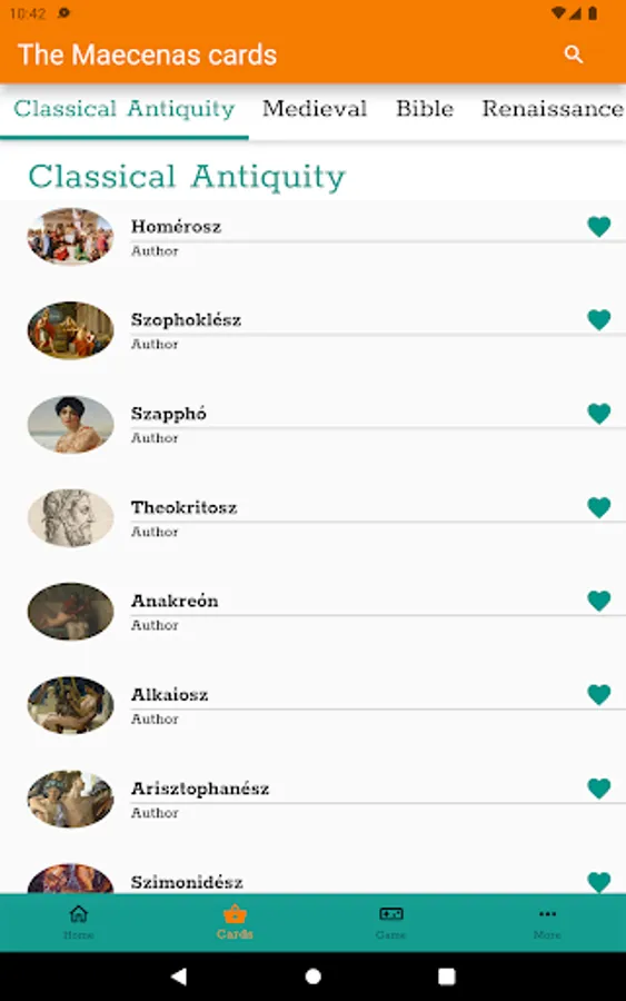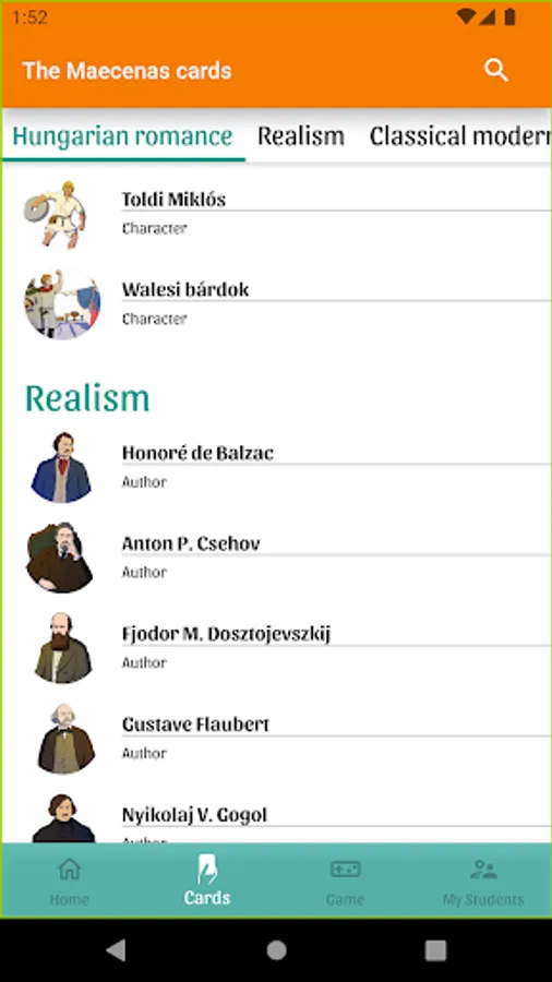 This app provides support to the Maecenate method and its card game. The Maecenate method is a Hungarian innovative pedagogical method used in literature lessons. Thousands of students and teachers can be familiar with the greatest writers and characters while playing the game and collecting Maecenate cards.