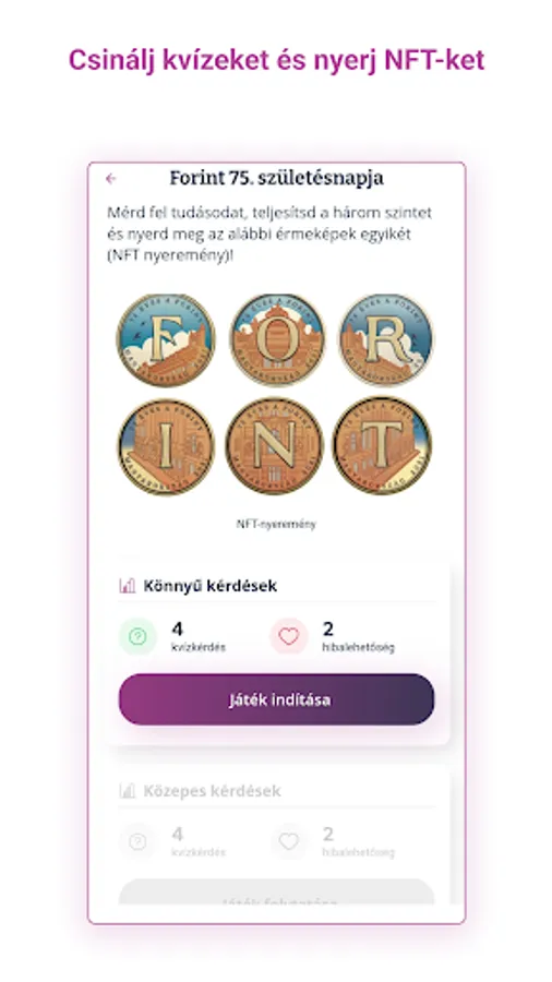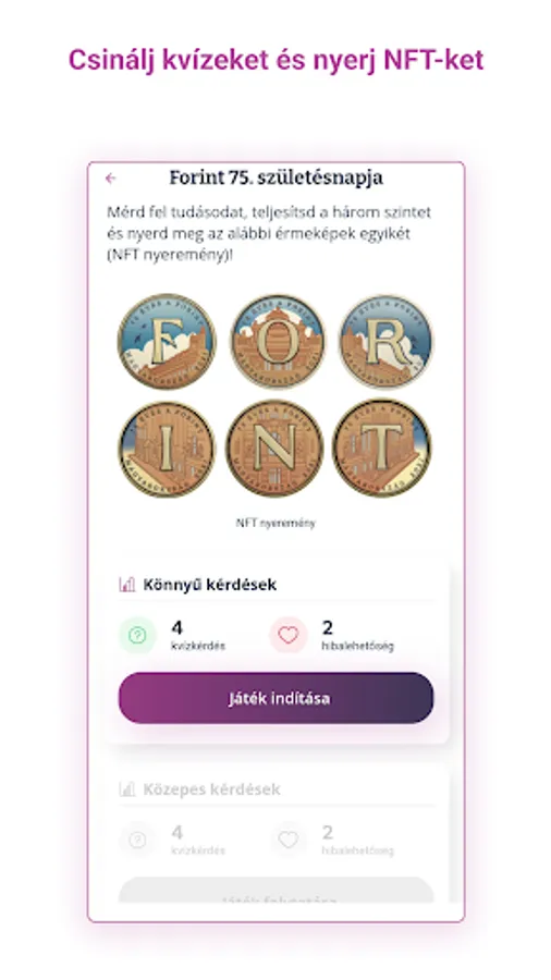 In the mobile application you can find information about the current events of the Mint, get to know the latest commemorative coin issues of the MNB and access the Mint's webshop. In addition, digital tokens (so-called NFTs) can be obtained in the application by completing quizzes, which you can collect to participate in sweepstakes.