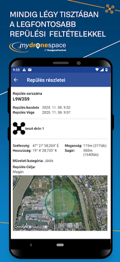 The application allows you to monitor the current status of Hungarian airspace in real time, as well as areas restricted or prohibited for drone operations. Mydronespace alerts users if the area marked by it affects restricted or prohibited airspace.