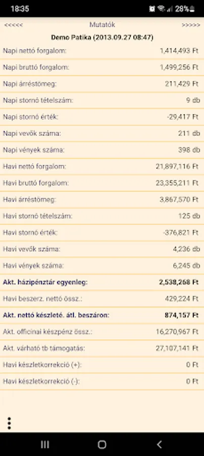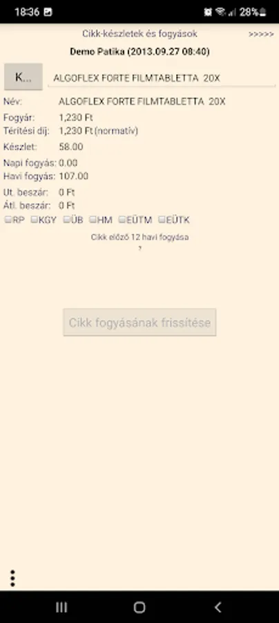 Kipróbálni, megnézni úgy lehet, hogy a „Patika azonosító:” mezőbe a „000000” kódot írjuk be. Ekkor az alkalmazás „Demo” módban indul el, minden megjelenített adat valótlan, csak és kifejezetten demonstrációként szolgál.