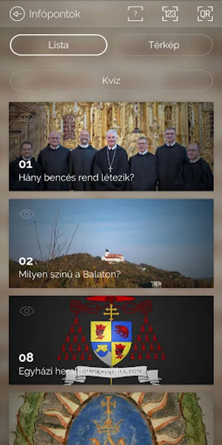 The application guides the visitor through the Tihany church and the exhibition on the Benedictine order. You are able to access different interactive and informational materials at the individual info points. You can navigate with the help of the interactive map or by choosing your topic of interest from the list view.
