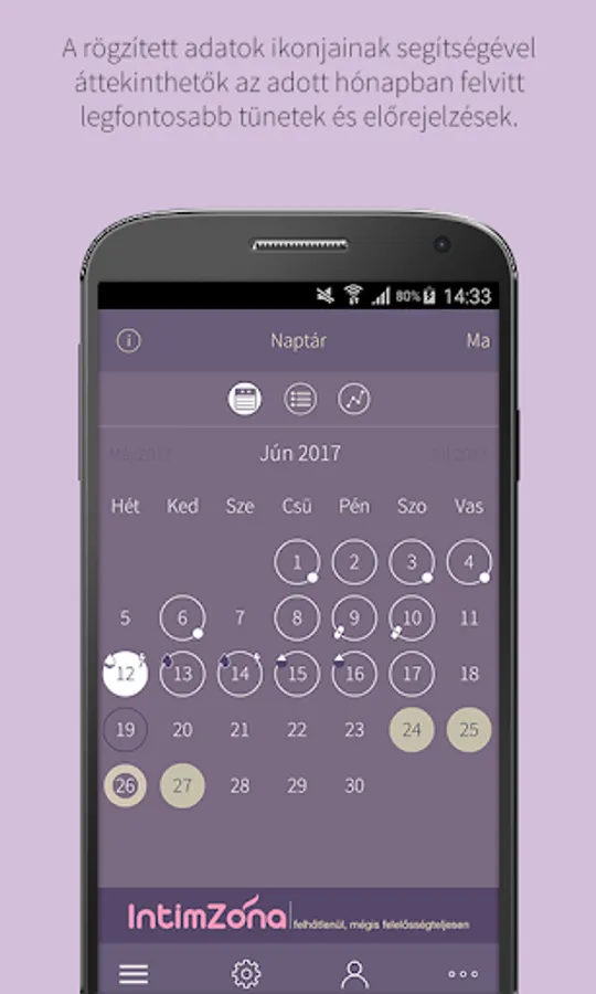 - In the Monthly View, you can use the icons to review the most important symptoms of a particular month and predicted data (such as applied contraceptives, next bleeding and ovulation).
