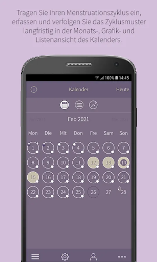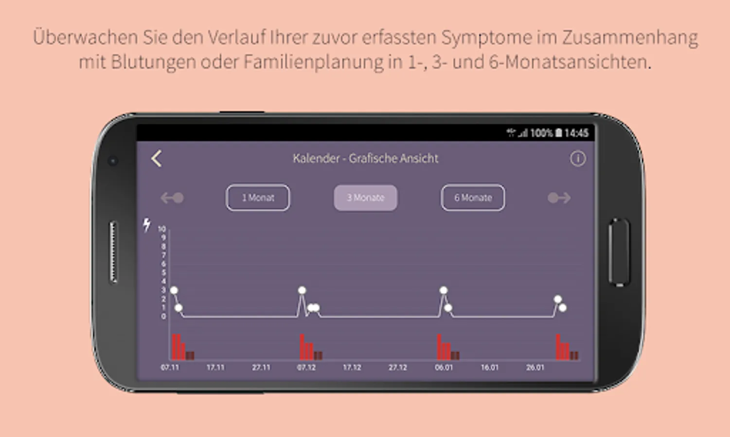 - Daily, monthly and list views as well as graphic views (1, 3 or 6 months) for tracking bleeding or family planning