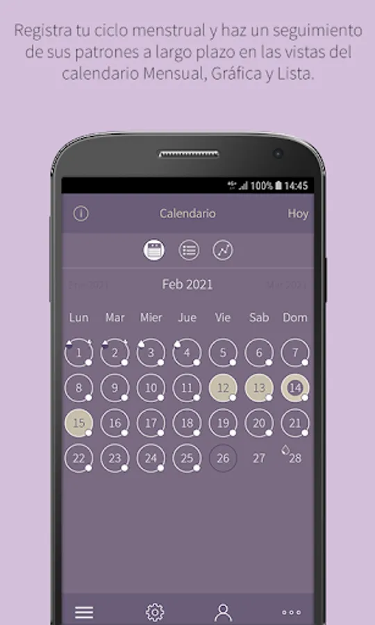 - Daily, monthly and list views and graphical views (1, 3 or 6 months) to monitor bleeding or family planning