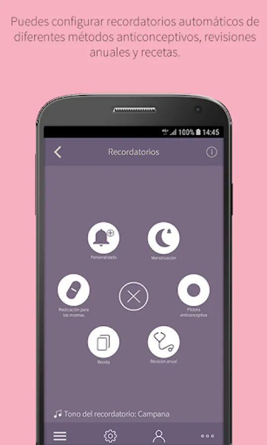 - Set up personalized reminders, of the menstrual cycle, of prescriptions, of your annual check-up, and of contraceptives or other medications