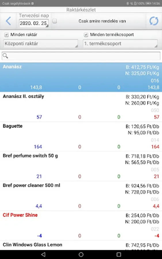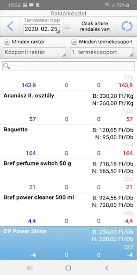 - Stock list, complete with quantities ordered per product.