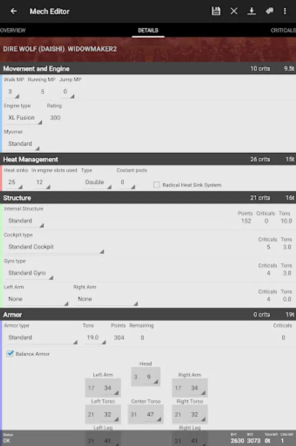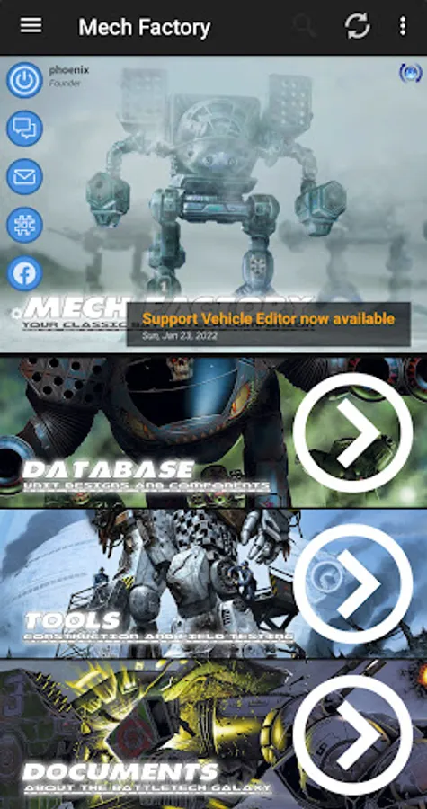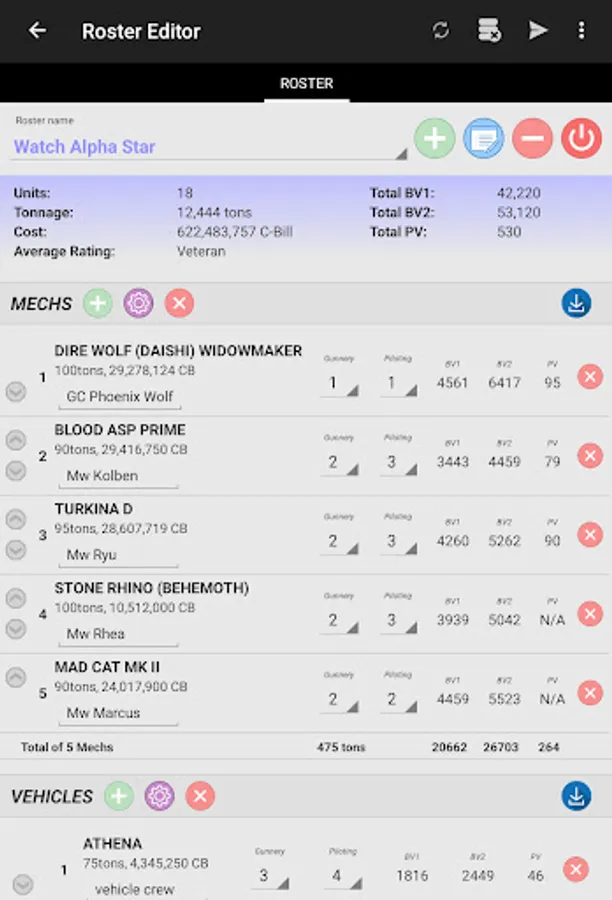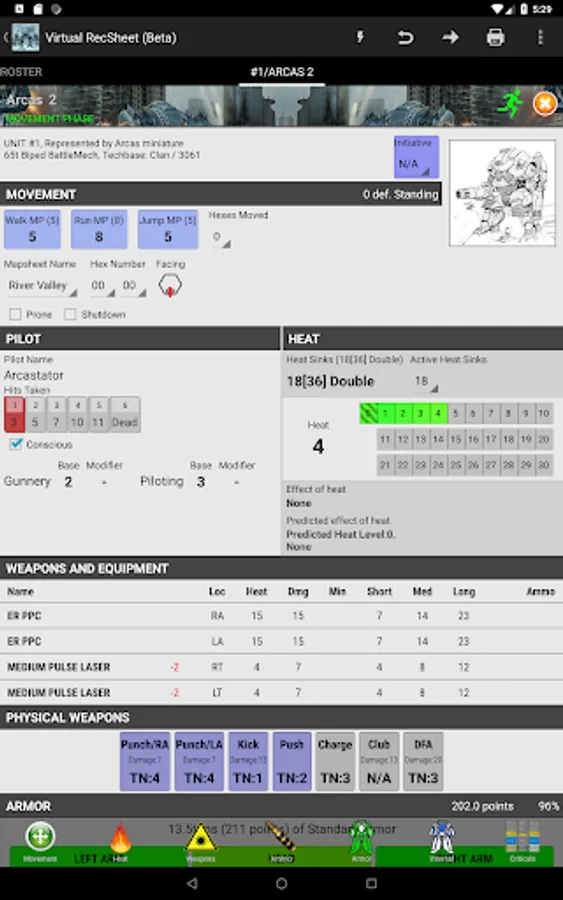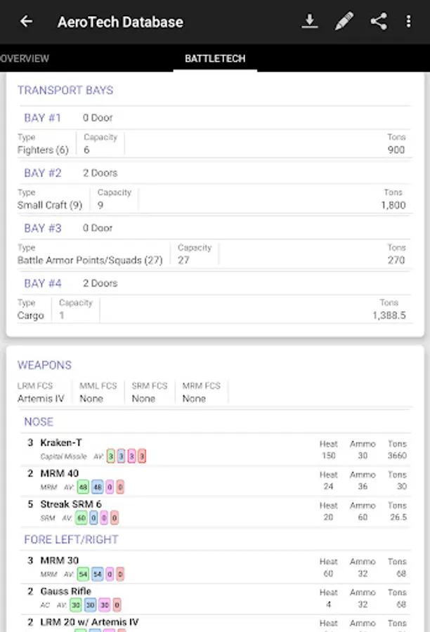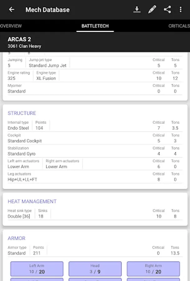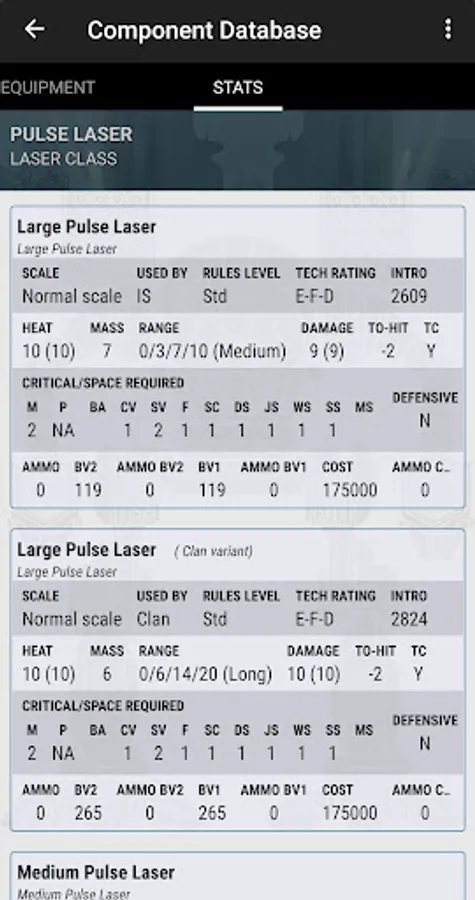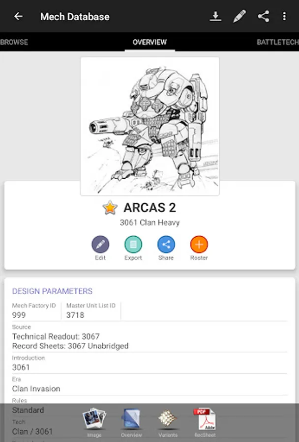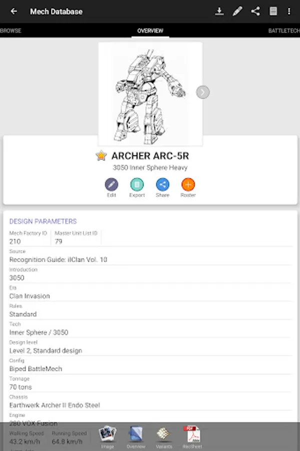 Beside the library the app features Mech, Combat and Support Vehicle, Aerospace, Battle Armor and Infantry Editors, a Roster Creator, a Virtual Record Sheet system and a simplified combat trial simulation to test out new or existing designs.