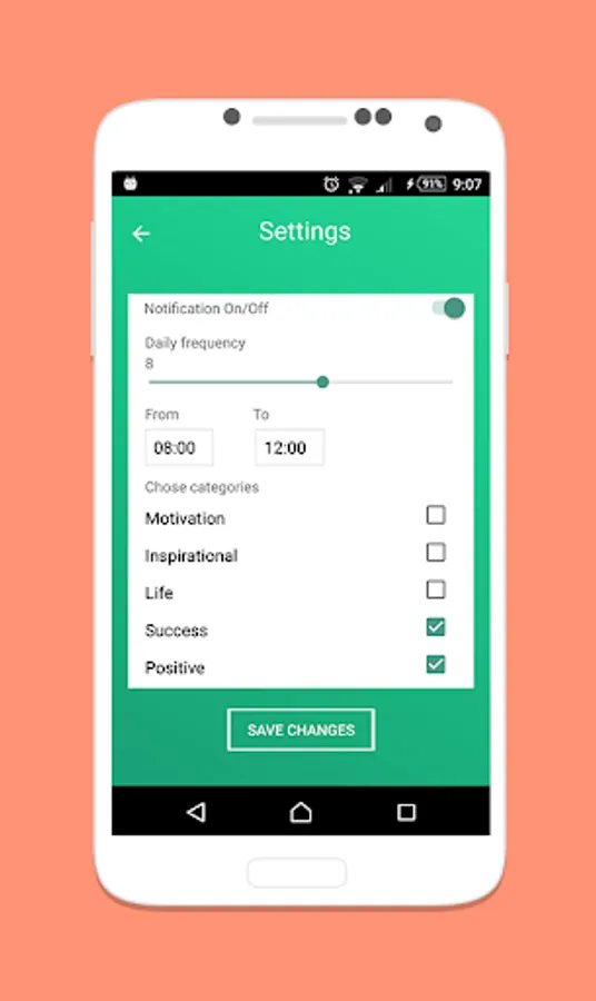 Chose from 5 categores that suit your goals and it will send you notifications at a set time interval