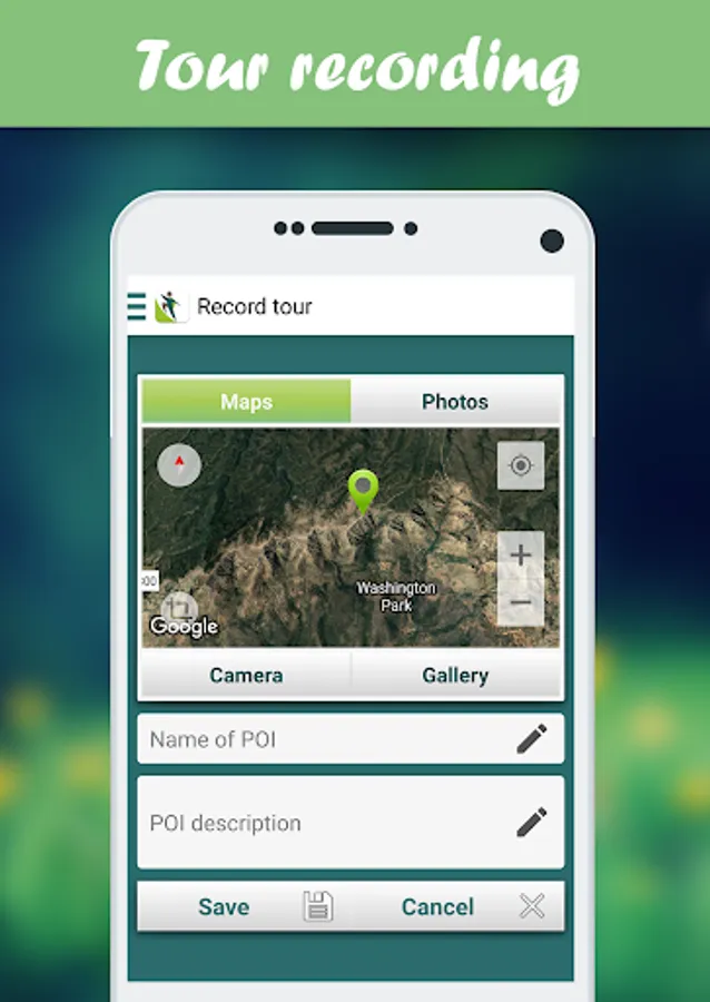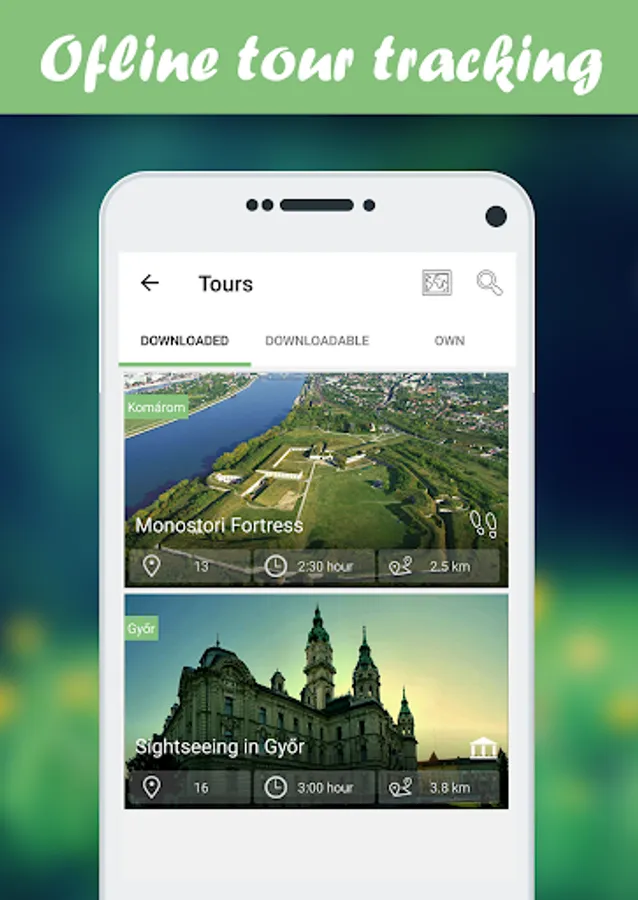 GPS-based functions: route recording, with attaching pictures, and description. Search between uploaded tours. Download and follow tours without internet connection.