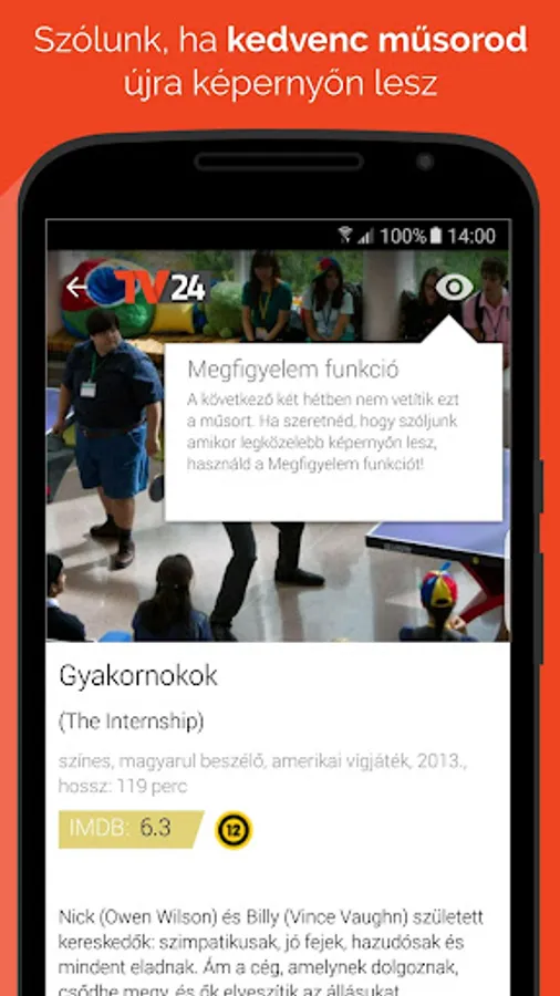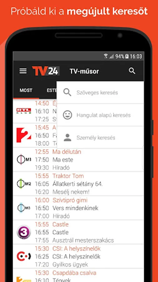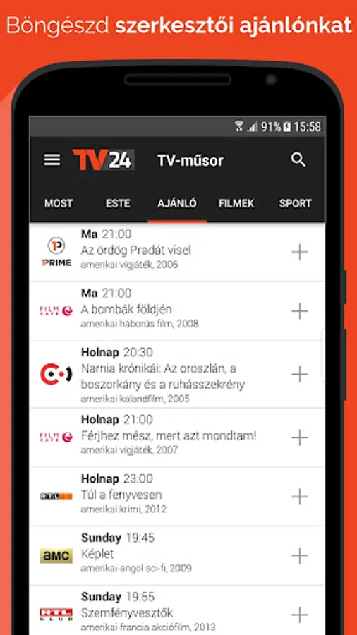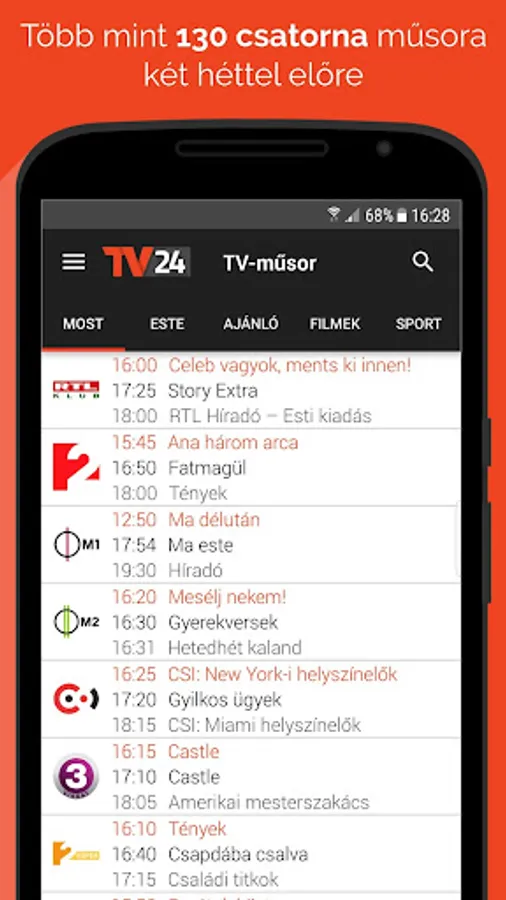 With the new TV24 Android app you can browse the program of many television channels. The application highlights currently running programs and notifies you before your favorite program starts. You can reorganize the channel list or browse TV news. The application is available in Hungarian only.