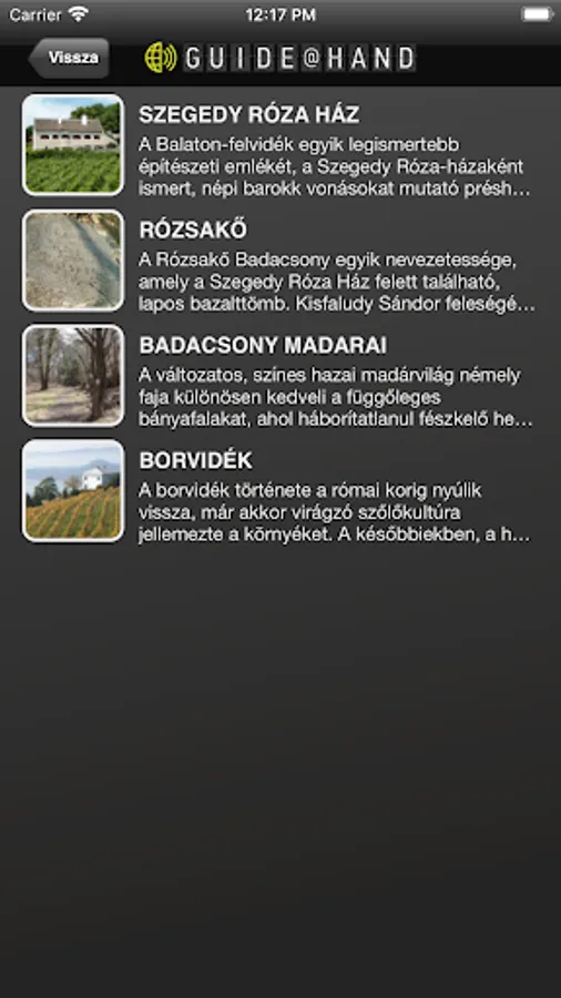 MAGYAR: A Badacsony GUIDE@HAND teljes turisztikai és a városnéző tartalmat, vezetett sétát, illetve térképet tartalmaz Badacsonyról.