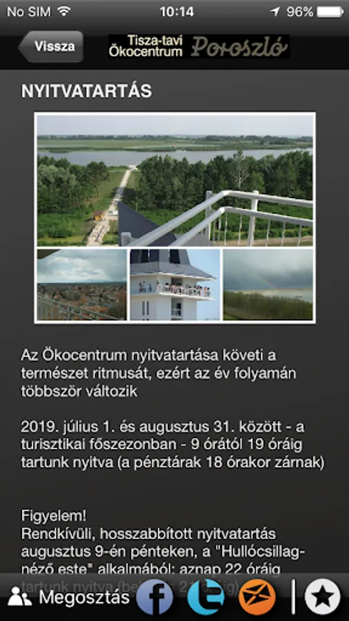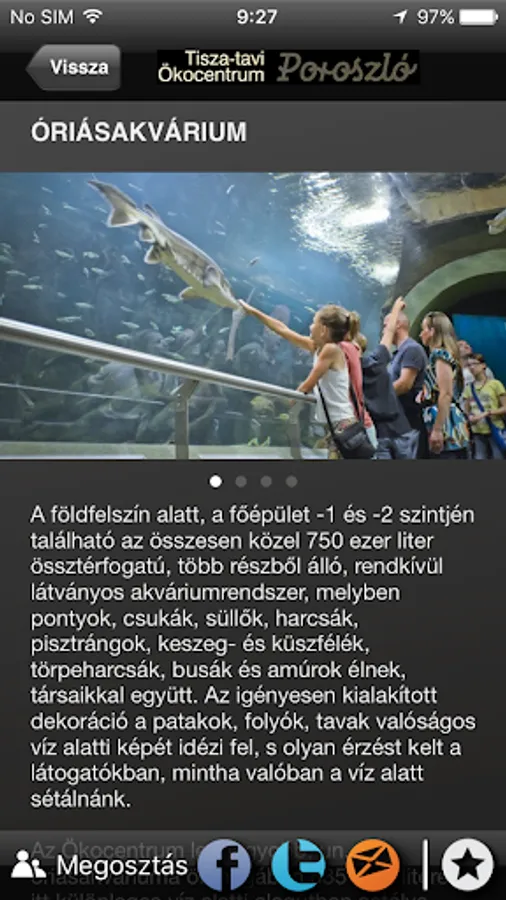 The Tisza Lake Ecocentre of Poroszló - a tourist attraction center for indigenous animals: a real spectacle that brings to the visitors the natural treasures of Lake Tisza and the Tisza Valley in a fun, modern and interactive way, presenting the second largest lake in Hungary . The application shows the visitor center, Poroszló and its surroundings in a detailed, thematic way.