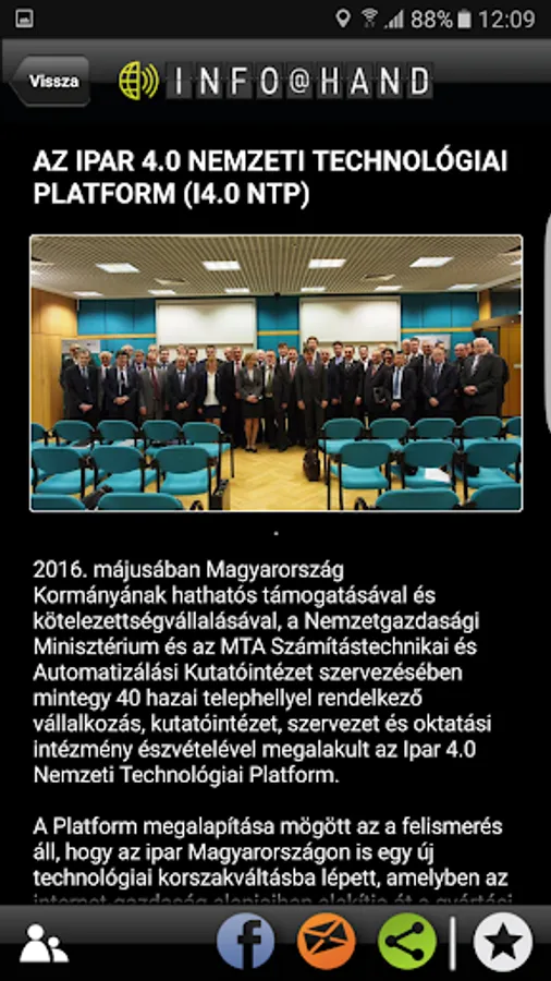 In May 2016, the Government of Hungary effective support and commitment of the Ministry of National Economy and organized by the Computer and Automation Research Institute of the enterprise, research institutes, organizations and educational institutions about 40 home sites located in észvételével the formation of the National Technology Platform Industry 4.0.