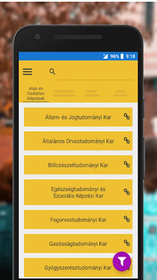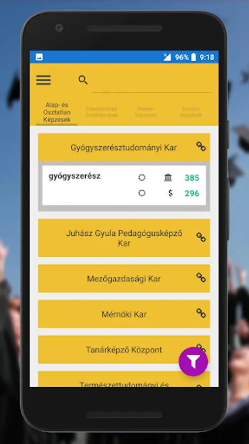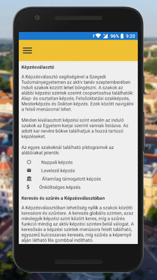 The purpose of the SZTE Enrollment Information mobile application is to provide information about the training courses of the University of Szeged to those wishing to study in a practical, easily searchable way. The application includes all courses starting in September and the current enrollment period for the previous enrollment period.