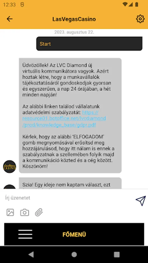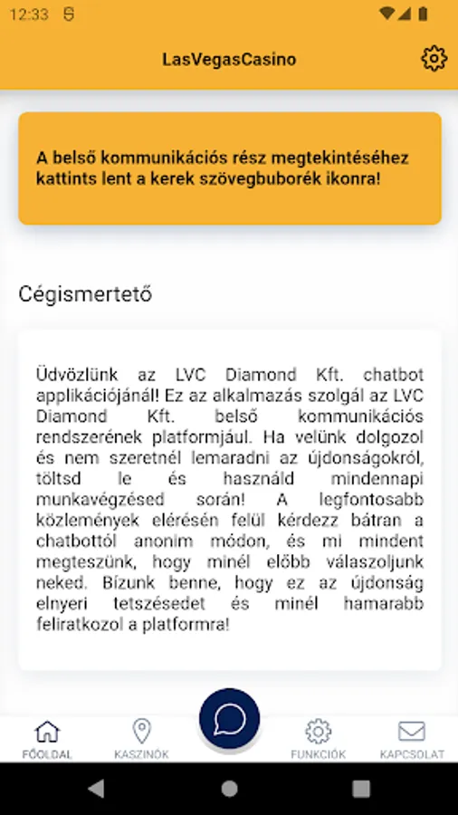 LasVegasCasino - LVC Diamond Kft.'s CHEQ application for the company's employees, an online communication tool of the Talk-A-Bot flagship product family primarily to support the company's HR and internal communication.