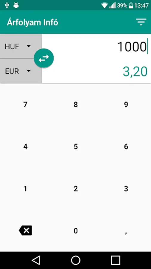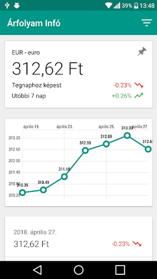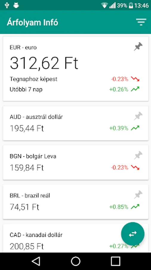Info Currency using the application always know the current official exchange rates. You can see that the exchange rate established in the past week. The highlight your favorite devizáidat, so you always appear at the top of the list, or place it on the home screen to always be aware of the current exchange rate.