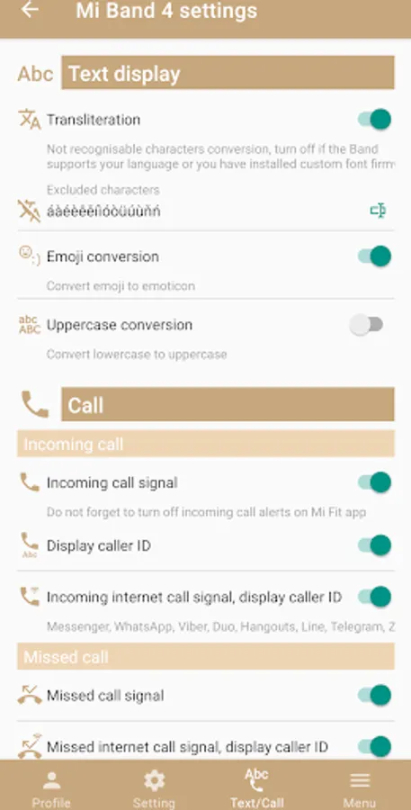 - missed call signal with caller display on Band/Amazfit