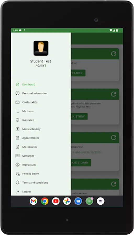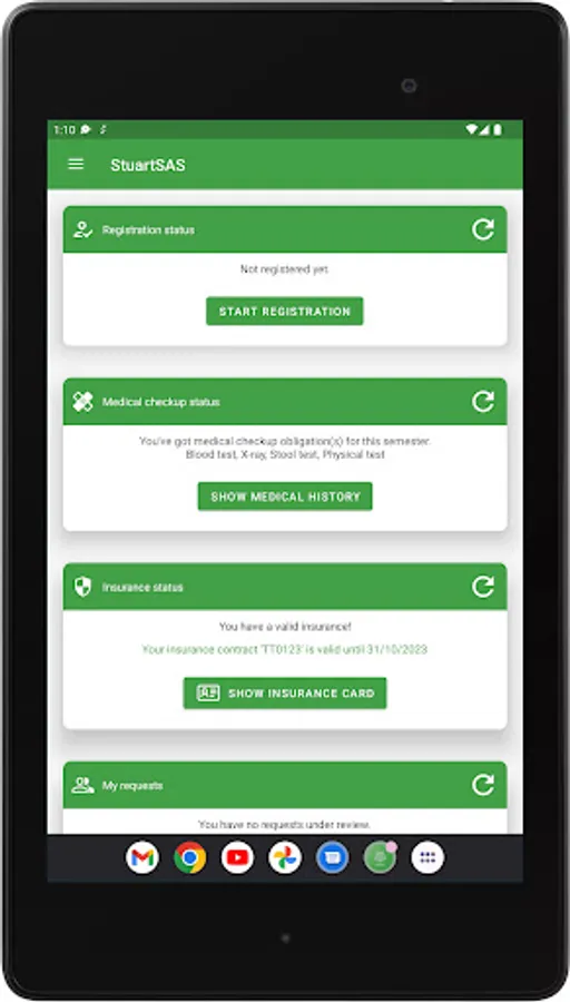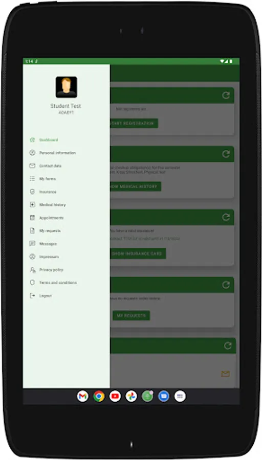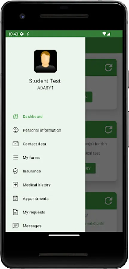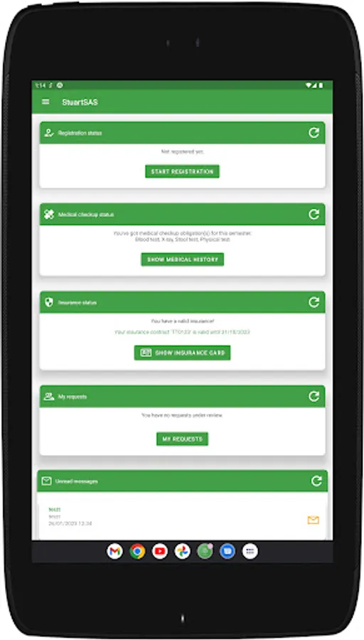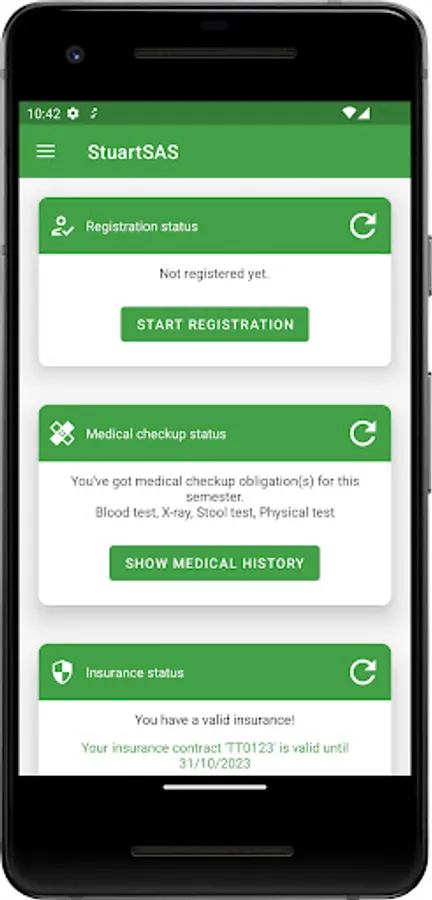 There are two widgets on the dashboard: registration and medical checkup. They can start or continue registration on the registration widget (if registration period is open). They can also book an appointment for the mandatory medical checkup on the medical checkup widget.