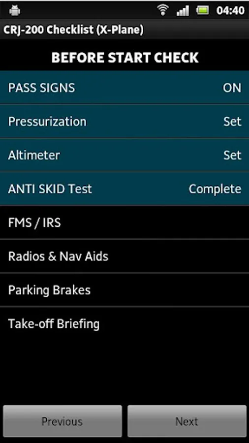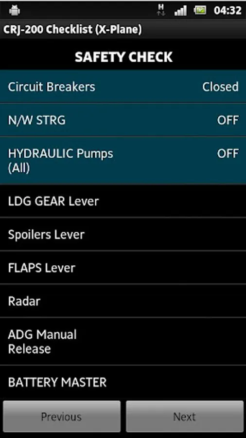 This app helps you to follow the standard checklist procedures in CRJ-200 cockpit.