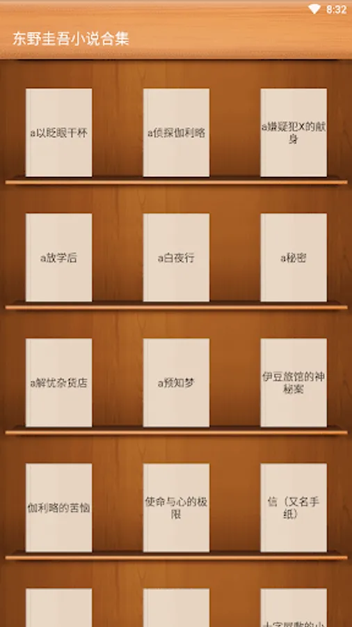 This application includes White Night Walk, After School, Secret, Suspect X's Devotion, Worry-free Grocery Store, Cheers in the blink of an eye, Predictive Dreams, Detective Galileo, Letter, Toilet Paper, White Horse Village Murder, Kidnapping Game, Pre-Graduation Killing Game, Transformation ,The Dying Eye,Who Owns the Cuckoo Egg,Super Murder Incident,Sleeping Forest,Unrequited Love,Poison Laugh Novels,Malicious,Wandering Blade,Avatar,Weird People,Ghost Laugh Novels,My Dead Home in the Past, Black Smile Novel, Red Finger, Murder by the Lake, Phantom Night, The Cloister Pavilion Murder, Galileo's Distress, Letters from Home, Meteor Bonds, Murder Night Without a Murderer, Roses and Daggers, Beautiful Murder Weapons, Rules of a Great Detective ,Rules of a Great Detective, Curse of a Great Detective, Love Story in a Parallel World, Gate of Murder, Girl Client, Relief of the Saint, Eleven-Character Murder, The Clown of the Cross House, Life, Mission and the Limits of Heart, Fate, Angel Ears, Murder in the Snow, The Mysterious Case of the Izu Inn by Keigo Higashino.