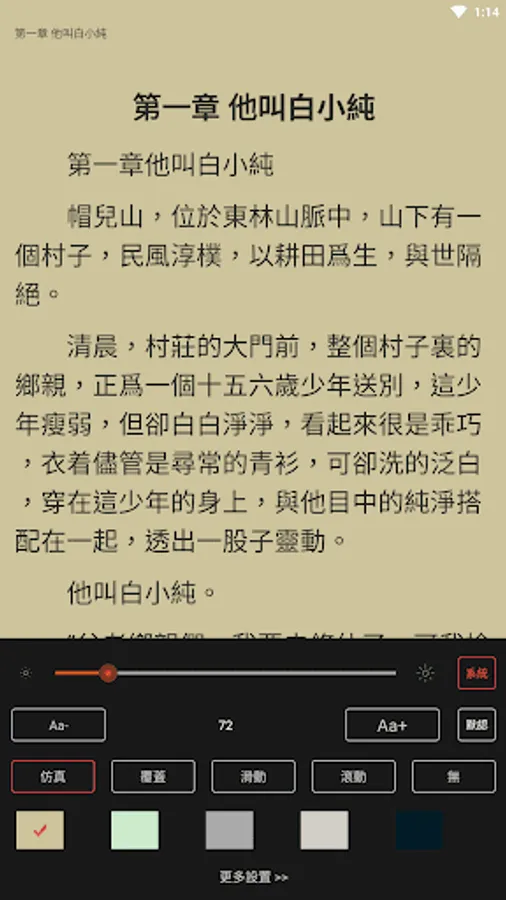 The function is simple and complete, there is a complete catalog, and the background when reading is also multi-choice, there is always one that suits your eyes, the volume button is used as a page-turning button, switching between traditional and simplified, brightness is adjustable, font size is adjustable , there are various page turning effects.