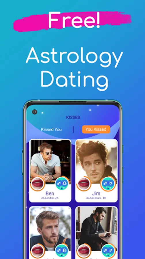 Astro Kiss Match is a free dating and friendship app that helps you meet new people with similar interests and matching astrology. In other words - we cut down the time it takes to truly meet someone compatible because the app connects you only with the people who are your zodiac match made in the stars.
