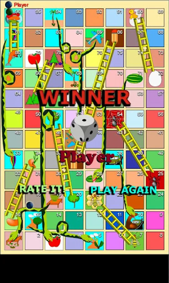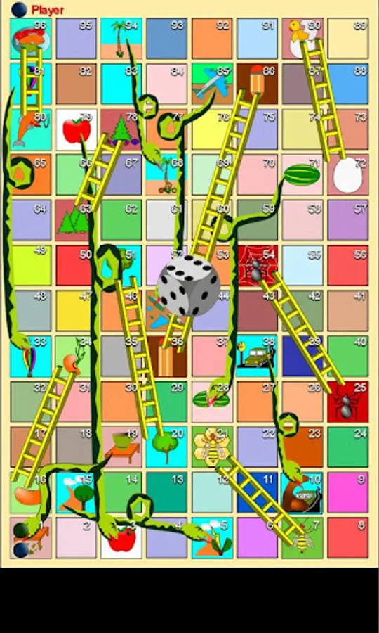 The board is divided into 96 boxes which also has snakes and ladders. With the ladders go up and with the snakes go down. At each turn the player throws a die and moves the number of boxes that will go on the die. The first to reach the box 96 (without going over) wins the game. It is played between 2 to 4 players that can be human or android