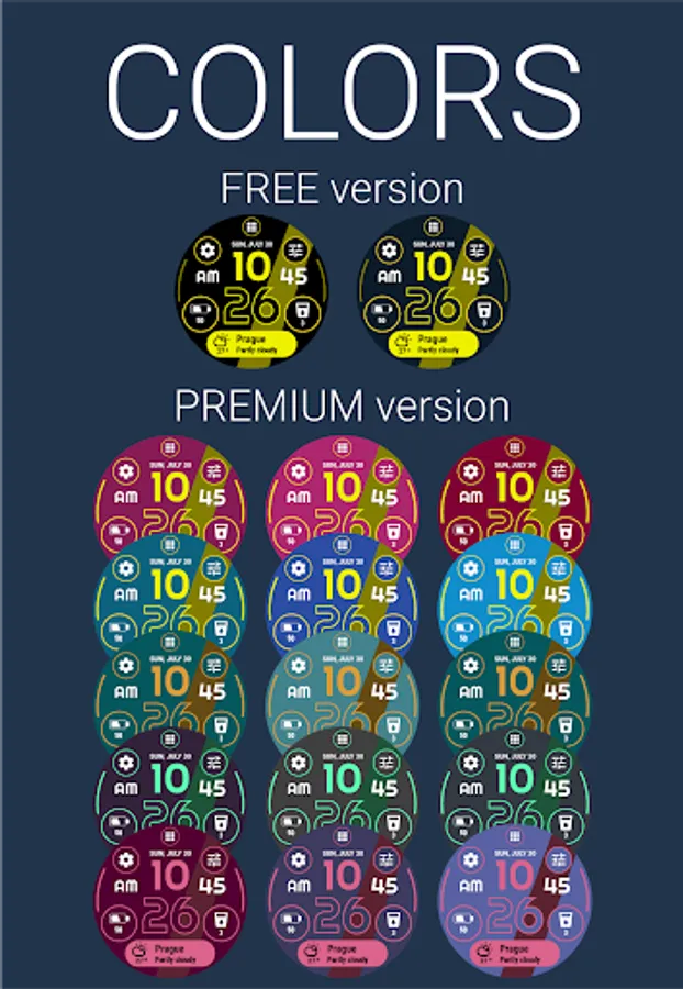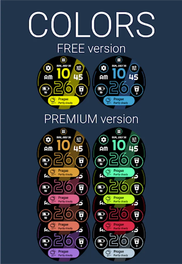 You can change any settings or adjust all features (the PREMIUM version) or all free features in the Watch Face configuration in the watch. You can also install a companion application that allows you to conveniently change any settings or adjust all features.