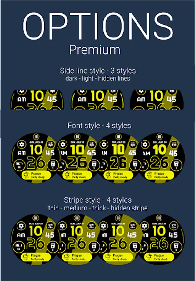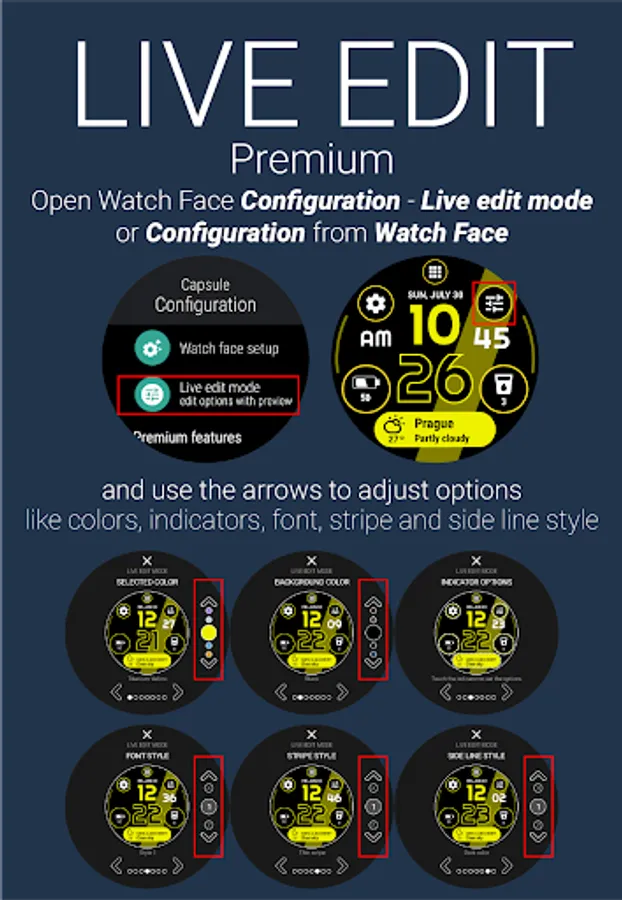 ★ Ability to change selected accent or background color, indicator options, font style, stripe style, and side line style, using the Live edit feature using the Watch Face preview