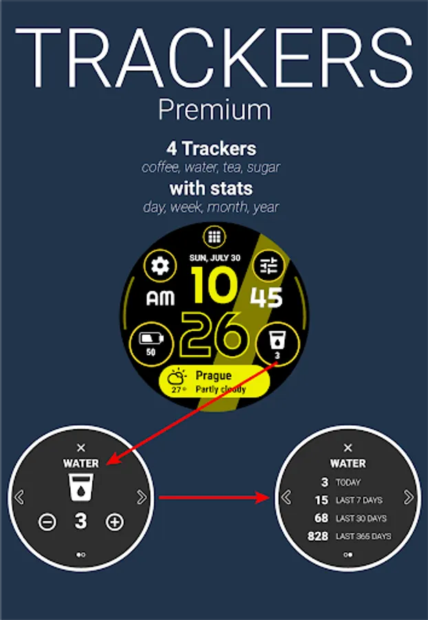 ★ 4 predefined trackers for water, tea, (etc...) intake with daily, weekly, monthly, and yearly statistics