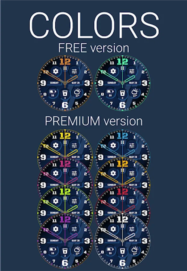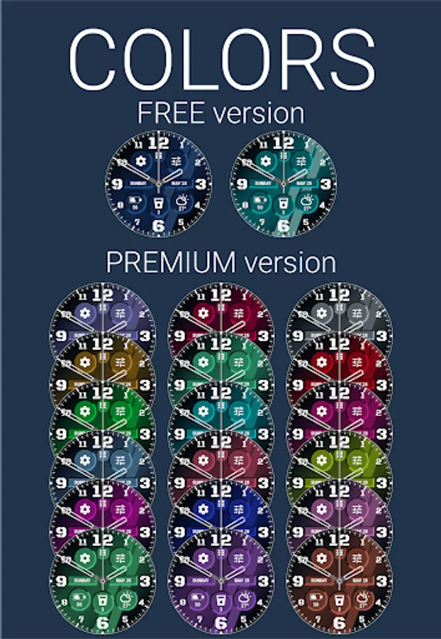 You can change any settings or adjust all features (the PREMIUM version) or all free features in the Watch Face configuration in the watch. You can also install a companion application that allows you to conveniently change any settings or adjust all features.