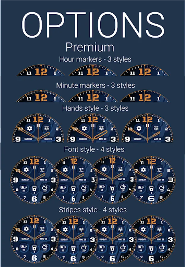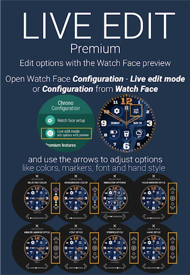 ★ Ability to change selected accent or background color hour marker, minute marker, font style, stripe style, and hand style, using the Live edit feature using the Watch Face preview