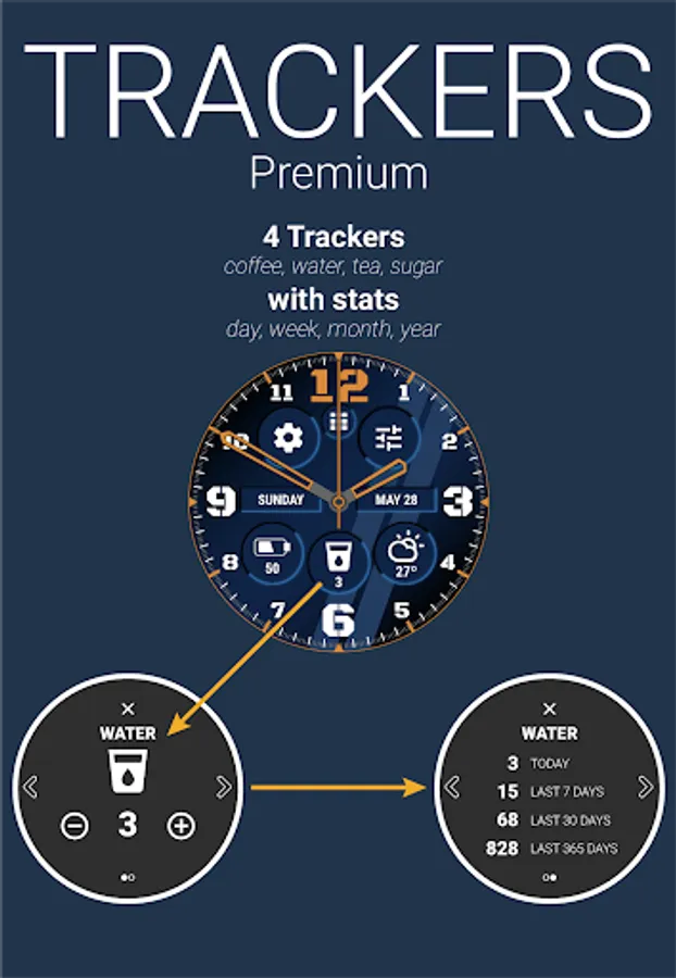★ 4 predefined trackers for water, tea, (etc...) intake with daily, weekly, monthly, and yearly statistics