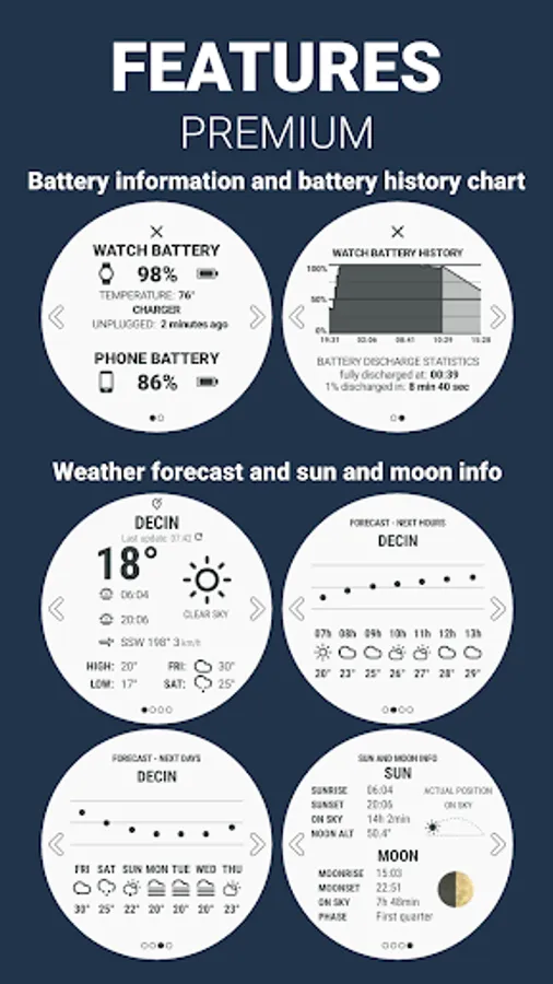 You can change any settings or adjust all features(the PREMIUM version) or all free features in the Watch Face configuration in the watch. You can also install a companion application that allows you to conveniently change any settings or adjust all features.